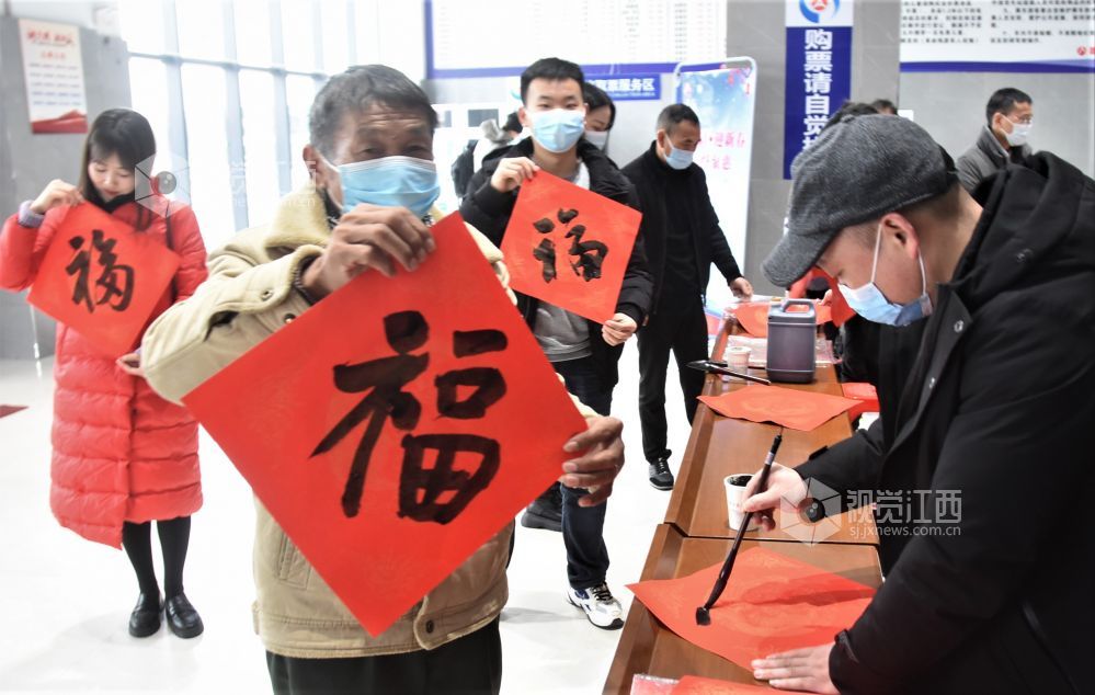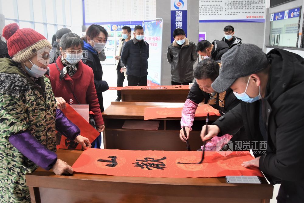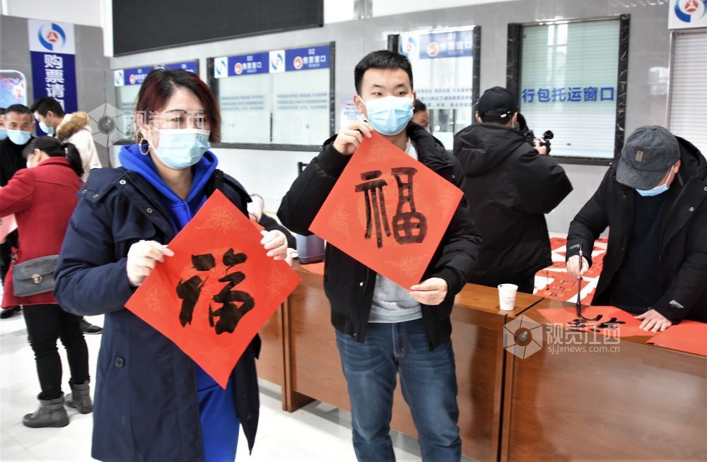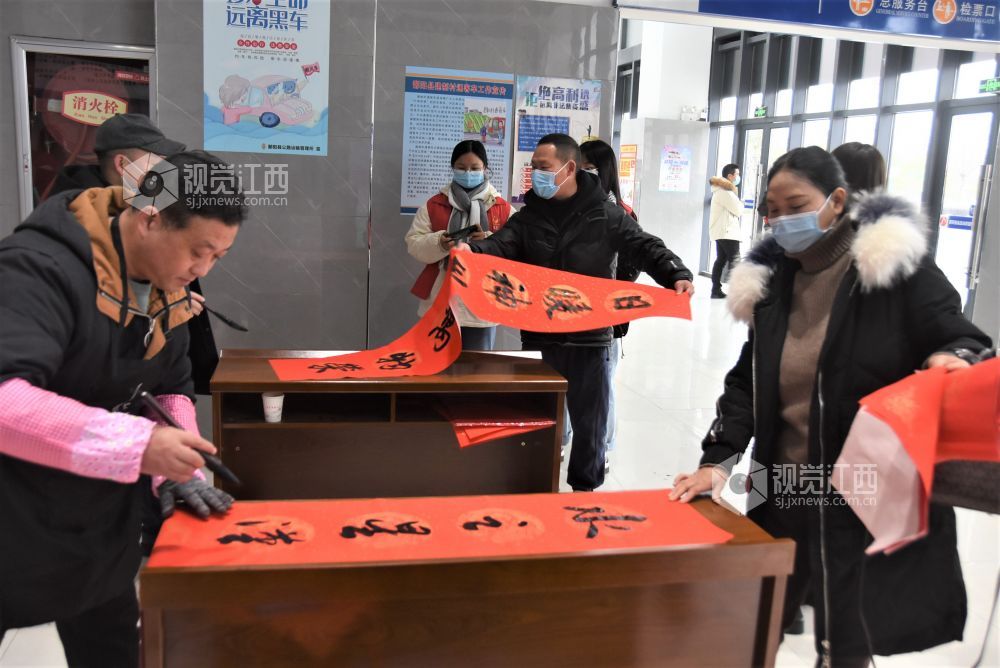 当天,正值严冬四九,北风夹雨寒气逼人,但上午书法家们就早早来到县客运总站开展为来往旅客书写新春对联送祝福。红红的对联,一张张福字让来往的旅客深感湖城冬日的温暖,也彰显出鄱阳的文明春风好客之道,受到旅客们的声声称道。