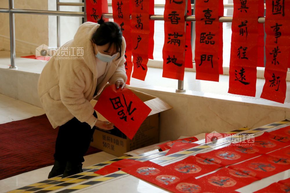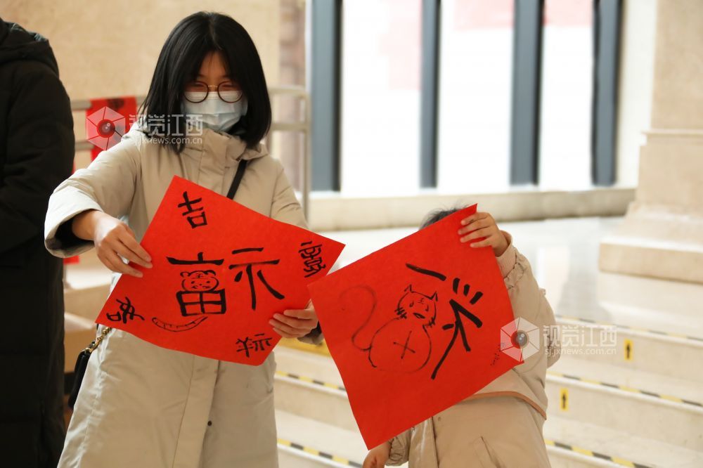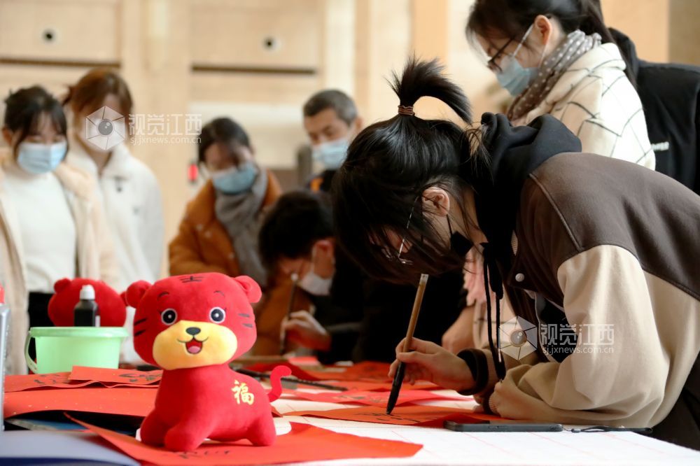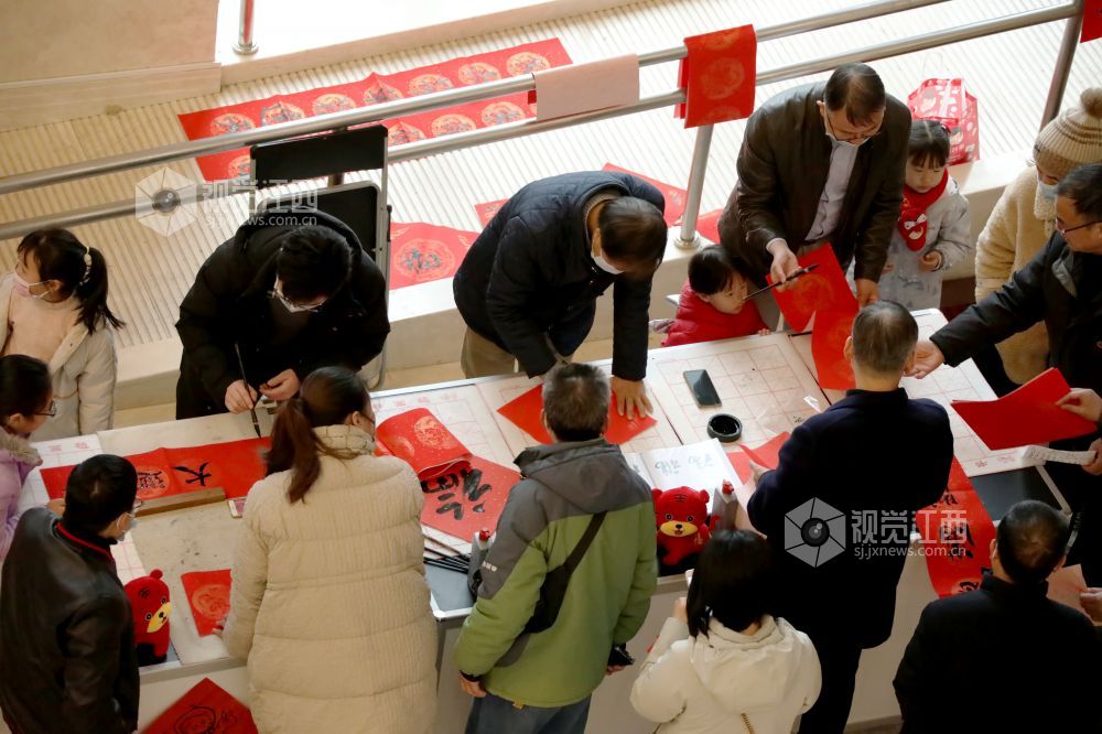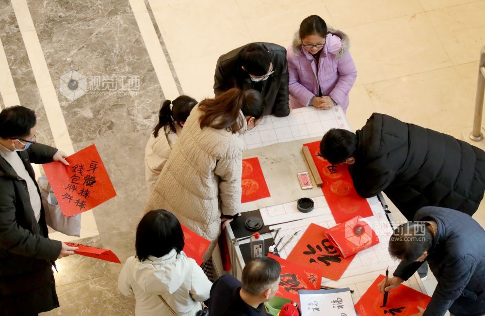 春节临近,在江西省美术馆一楼大厅暖意浓浓,人头攒动。书法老师和市民们现场挥毫书写美好祝福,共同表达新春愿望,为即将来临的虎年春节增添了喜庆氛围。