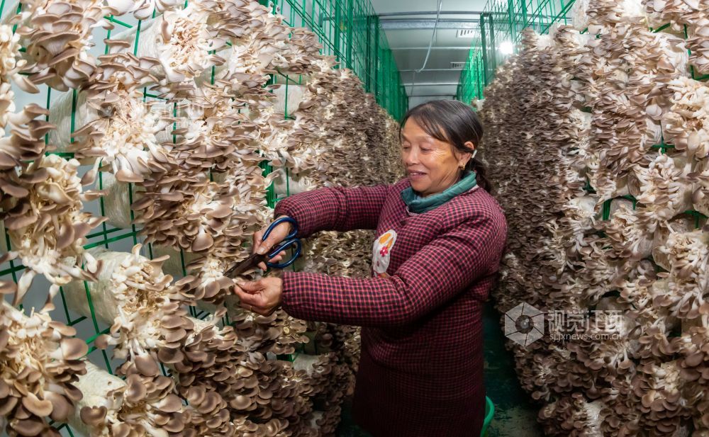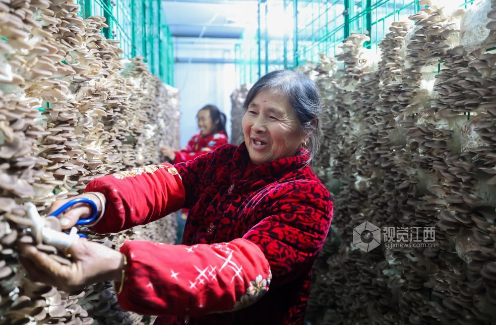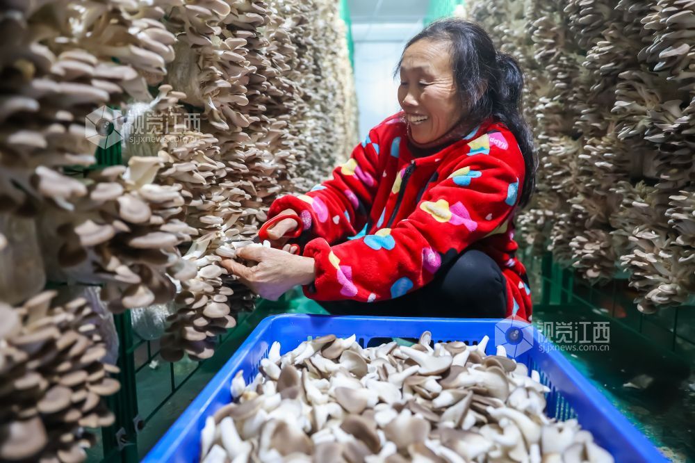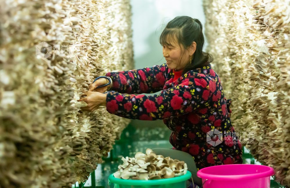 2022年1月17日,江西省瑞昌市夏畈镇秀珍菇种植基地,村民在采摘新鲜秀珍菇供应市场。
