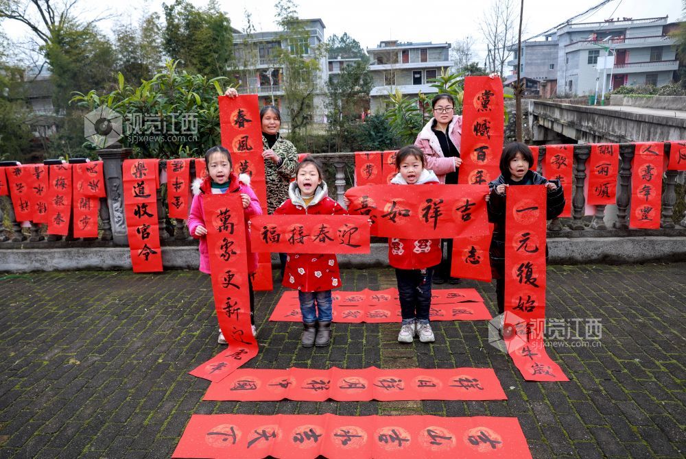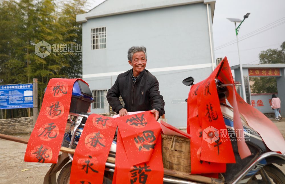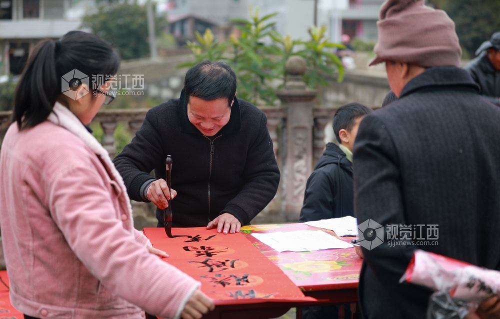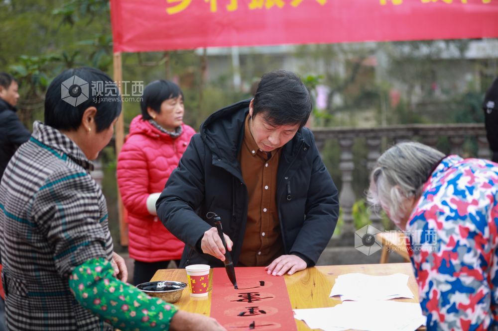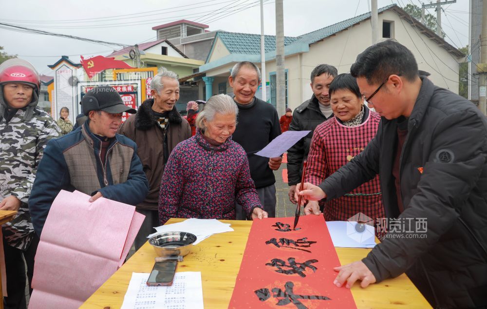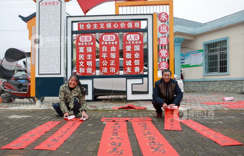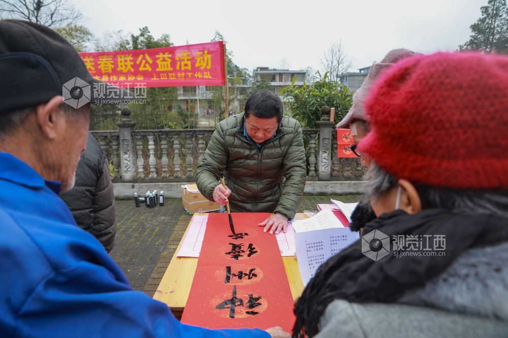 新年将至,年味渐浓,江西省吉安市吉水县白沙镇上田村喜气洋洋,驻村帮扶干部邀请文化志愿者自带笔墨红纸来到村里,免费为村民书写春联,为乡村新年增添喜庆。