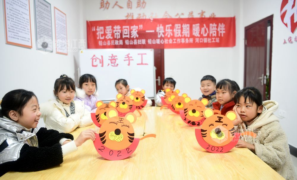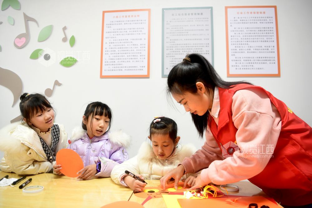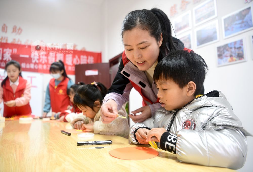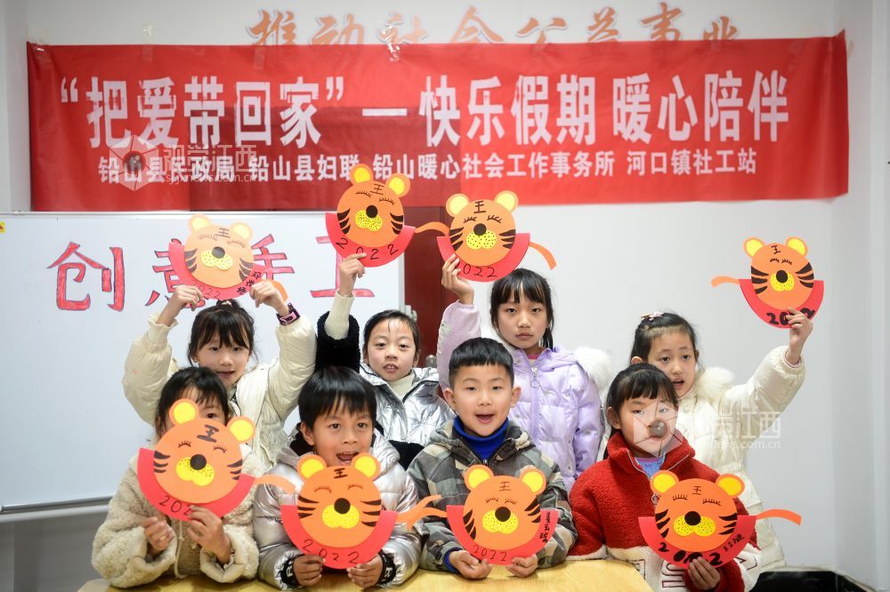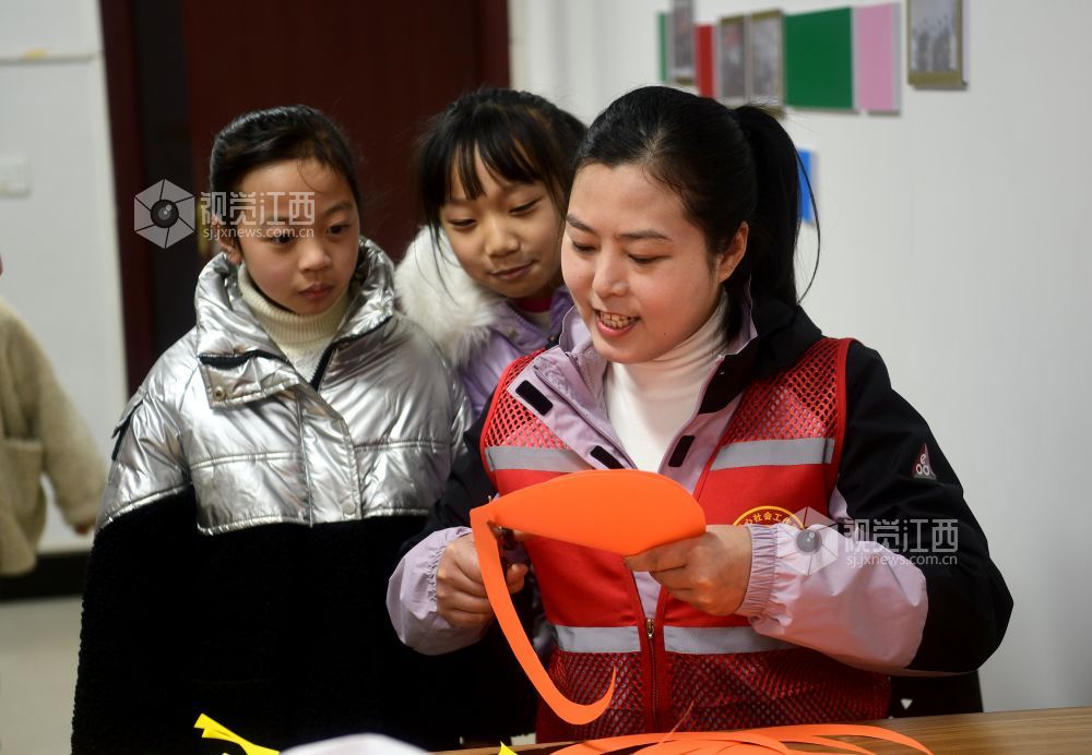 2022年1月22日,在江西省上饶市铅山县河口镇新时代文明实践所,铅山暖心社会工作事务所志愿者正在教授孩子们制作手工。为“就地过年”及假期无人监管的孩子营造较好的学习环境和积极的学习氛围,铅山县委宣传部联合县民政局、县妇联、县团委、铅山暖心社会工作事务所开展“把爱带回家——快乐假期 暖心陪伴”活动,给留守儿童、困境儿童、社会散居孤儿等开设音乐沙龙、安全教育小课堂、创意手工、多彩课堂、暖心伴读--读党史念党恩、传承好家风等课程,增加孩子们的阅读量,培养阅读兴趣,了解安全知识,增强动手能力,丰富假期生活,让孩子们度过一个丰富多彩的春节。