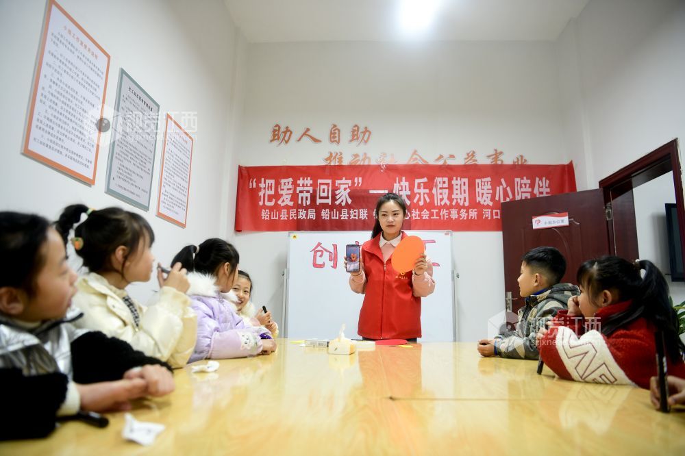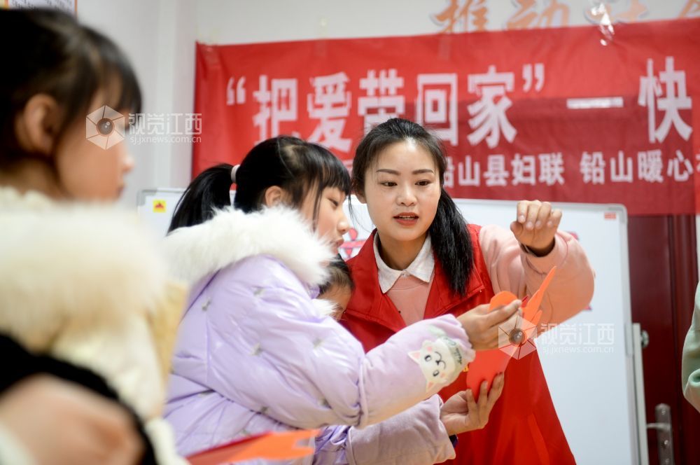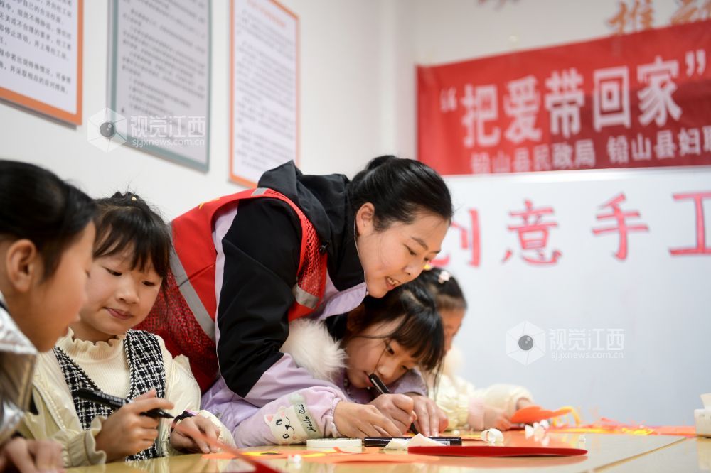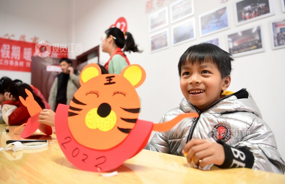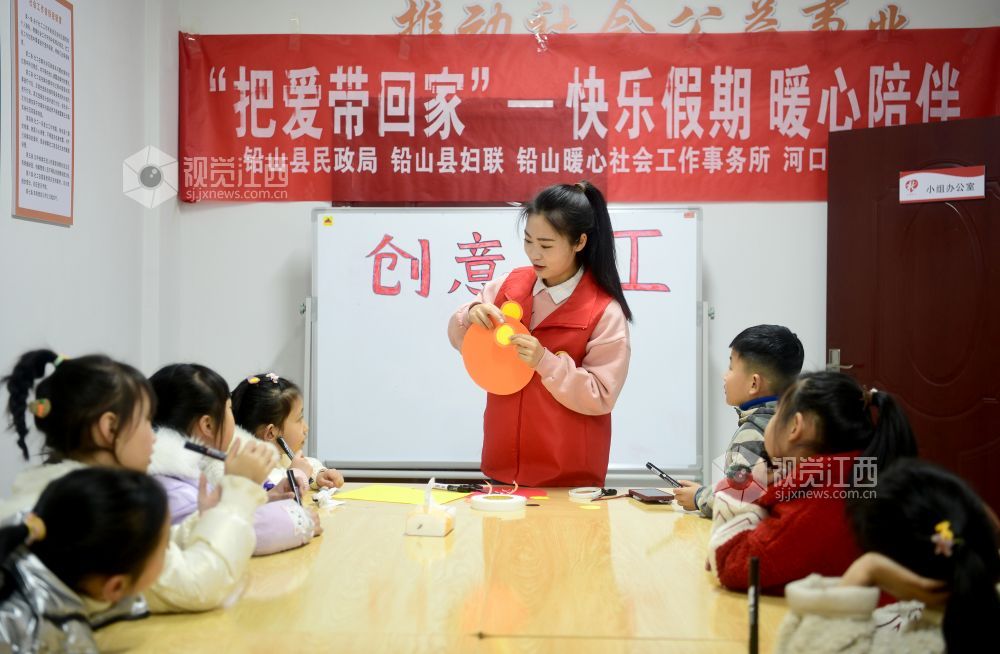 2022年1月22日,在江西省上饶市铅山县河口镇新时代文明实践所,铅山暖心社会工作事务所志愿者正在教授孩子们制作手工。为“就地过年”及假期无人监管的孩子营造较好的学习环境和积极的学习氛围,铅山县委宣传部联合县民政局、县妇联、县团委、铅山暖心社会工作事务所开展“把爱带回家——快乐假期 暖心陪伴”活动,给留守儿童、困境儿童、社会散居孤儿等开设音乐沙龙、安全教育小课堂、创意手工、多彩课堂、暖心伴读--读党史念党恩、传承好家风等课程,增加孩子们的阅读量,培养阅读兴趣,了解安全知识,增强动手能力,丰富假期生活,让孩子们度过一个丰富多彩的春节。