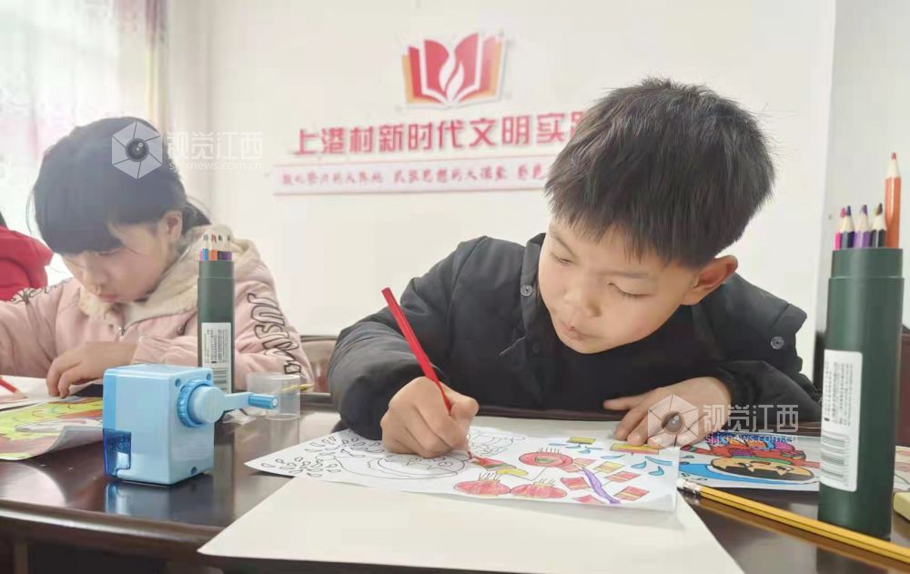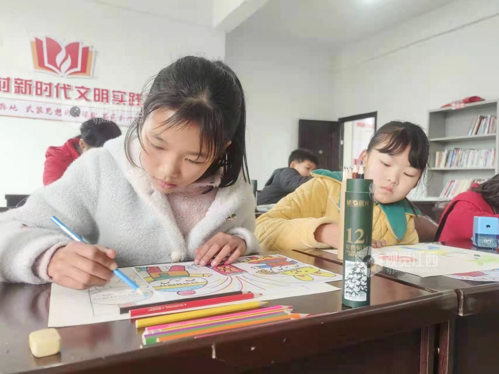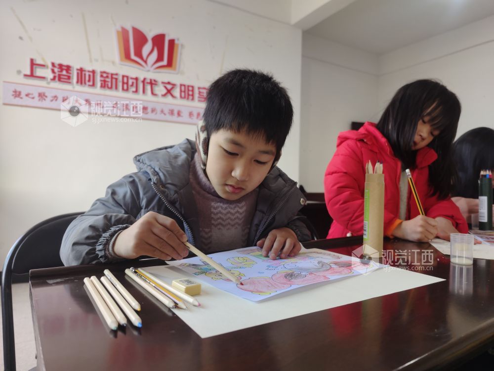 2022年1月20日,在江西省铅山县湖坊镇上港村新时代文明实践站,孩子们正在作画。