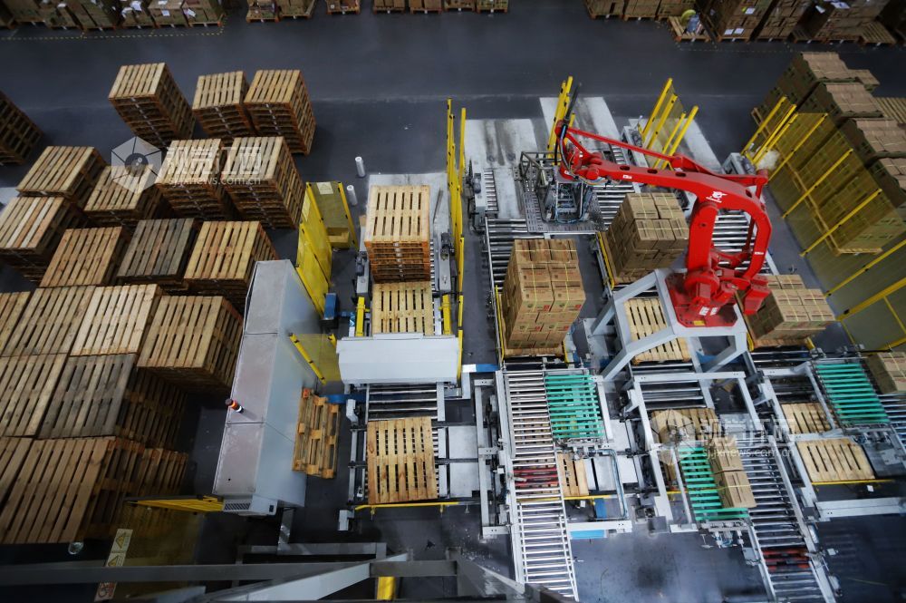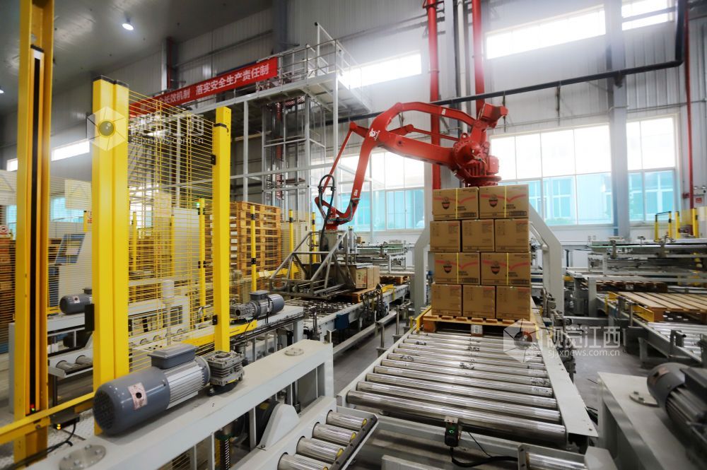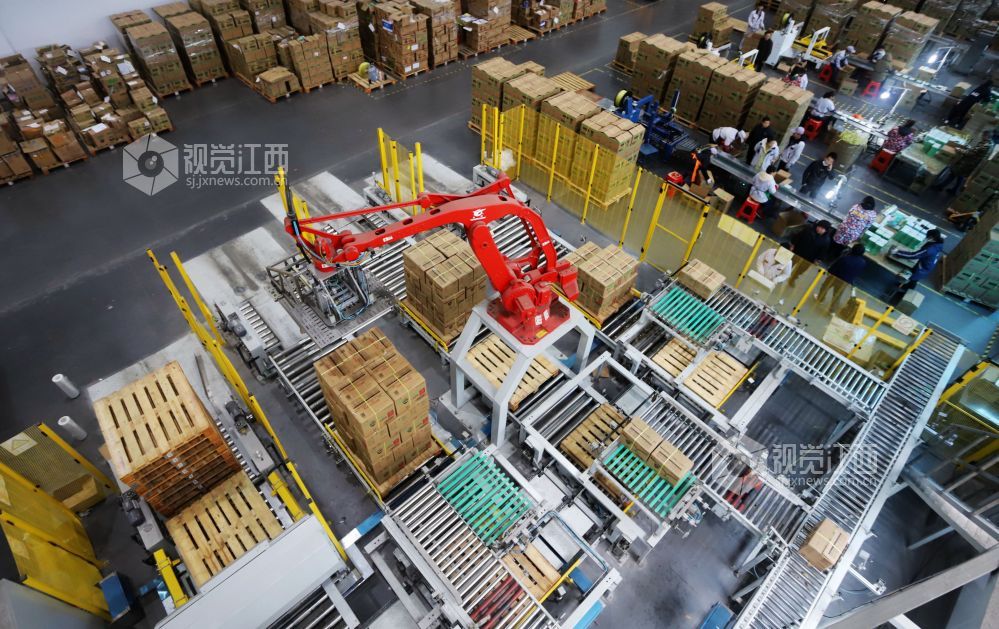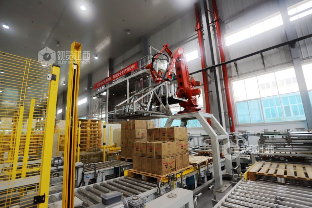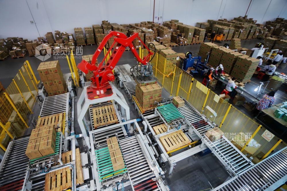 2022年1月26日,江西省吉安市安福县一家企业智能化仓储车间机器人在抓取产品。