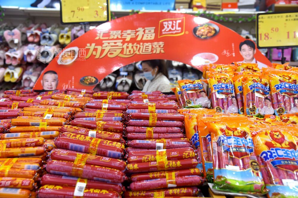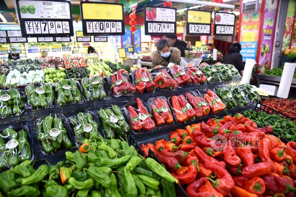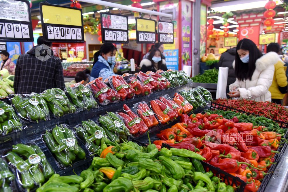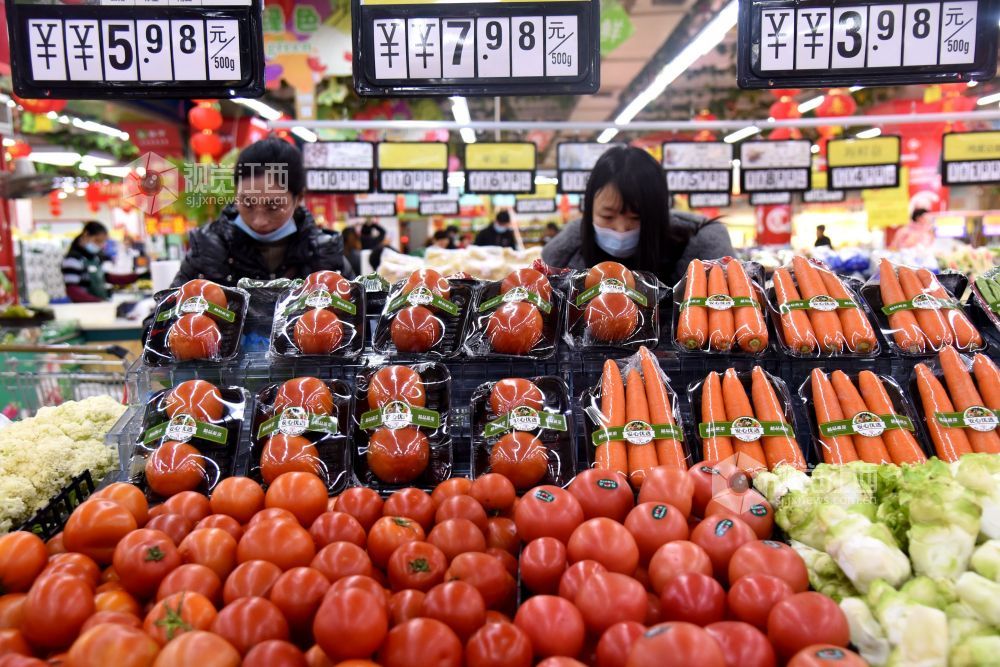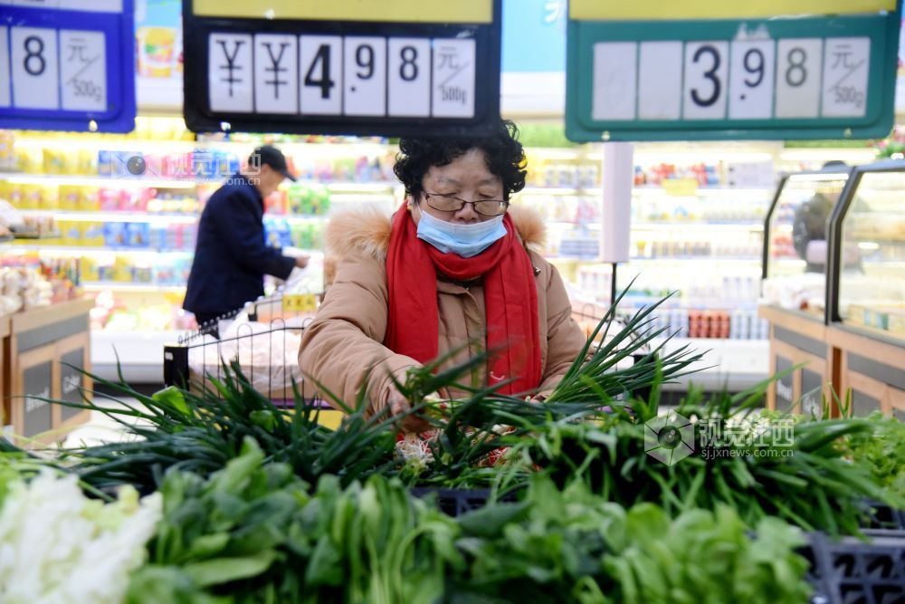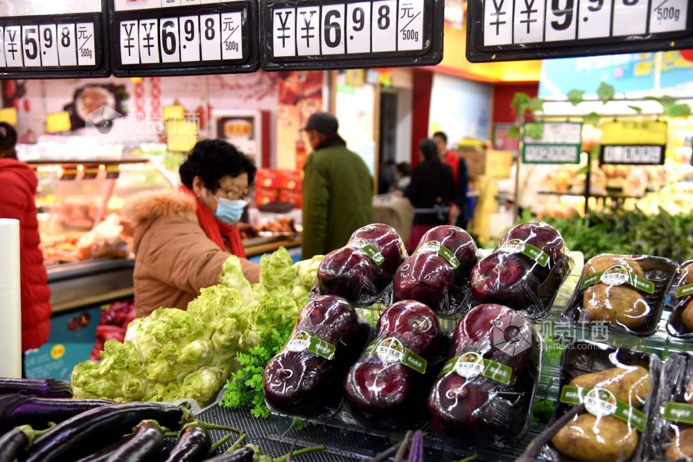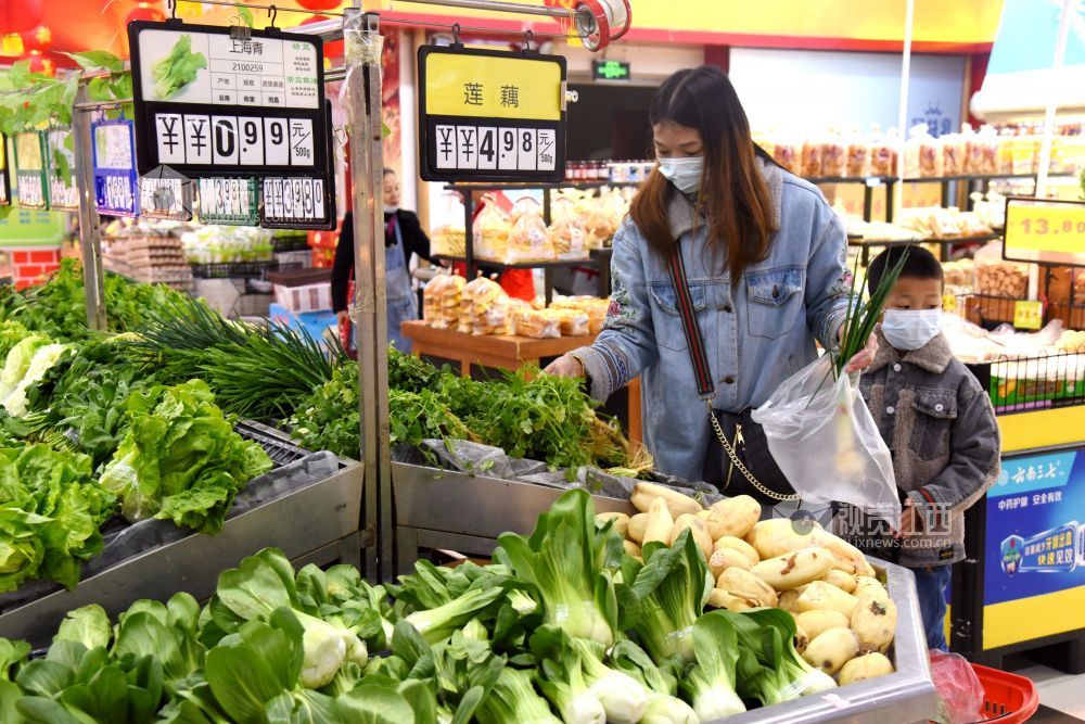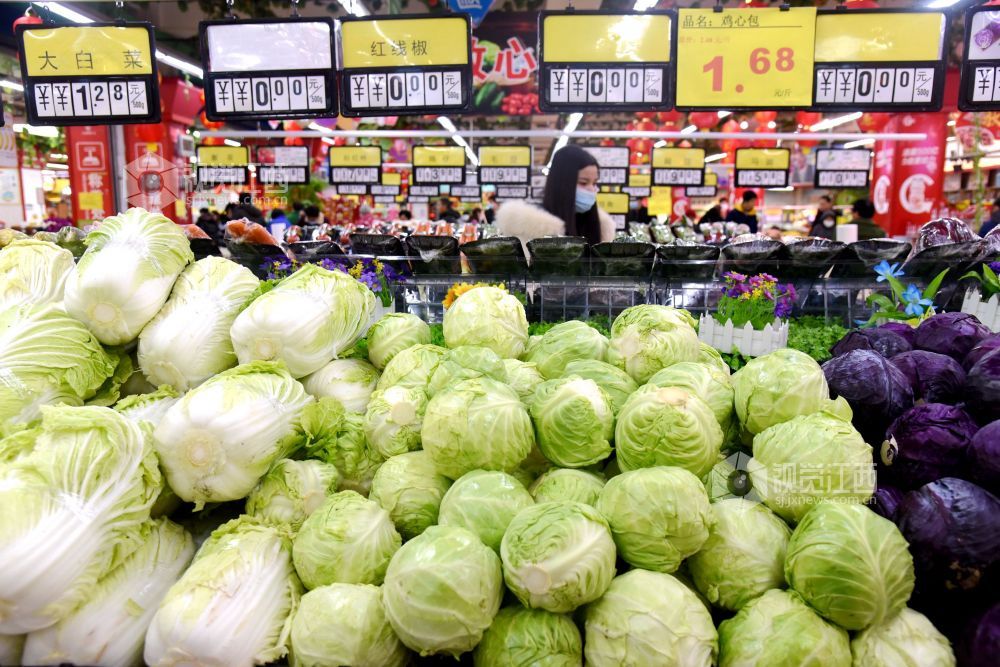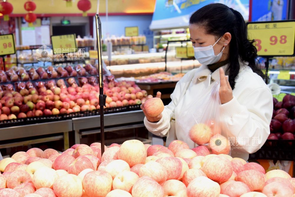 2022年1月27日,在江西省抚州市南丰县万家福超市货架上,商品琳琅满目,各类蔬菜、水果、糖果饼干摆放有序,肉、蛋、奶制品、食用油等生活必需品供应充足,不少市民们前来采购。