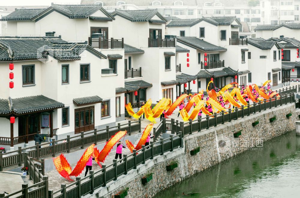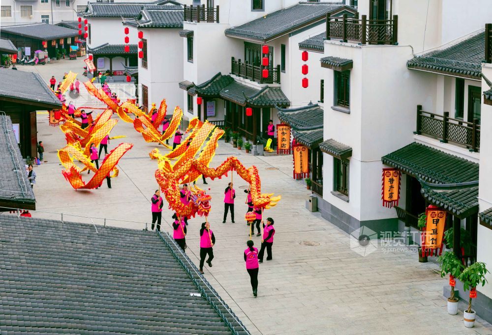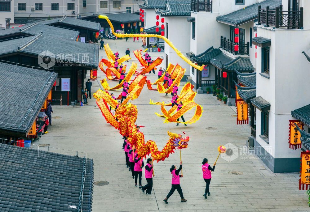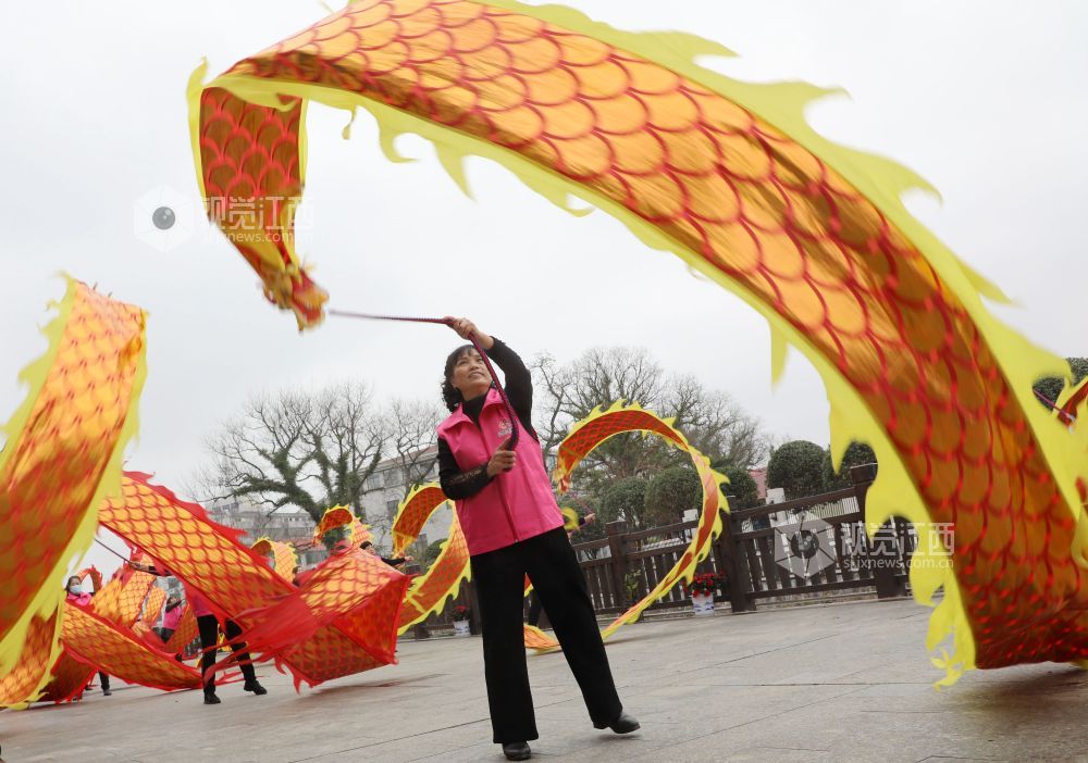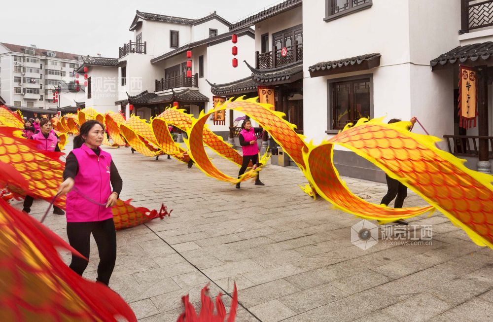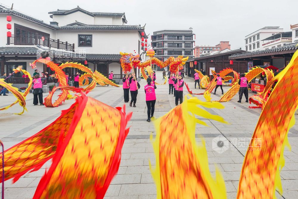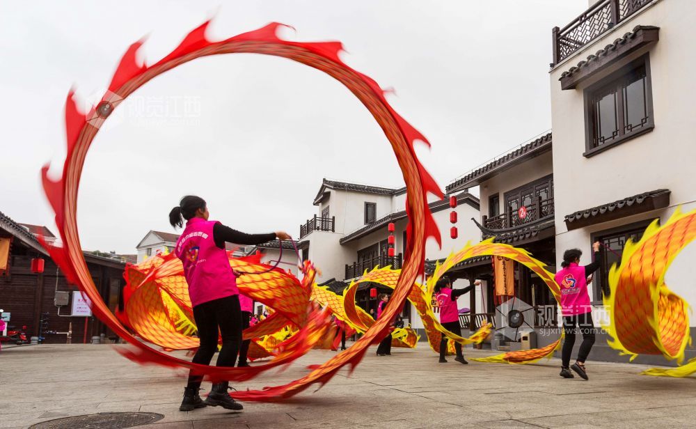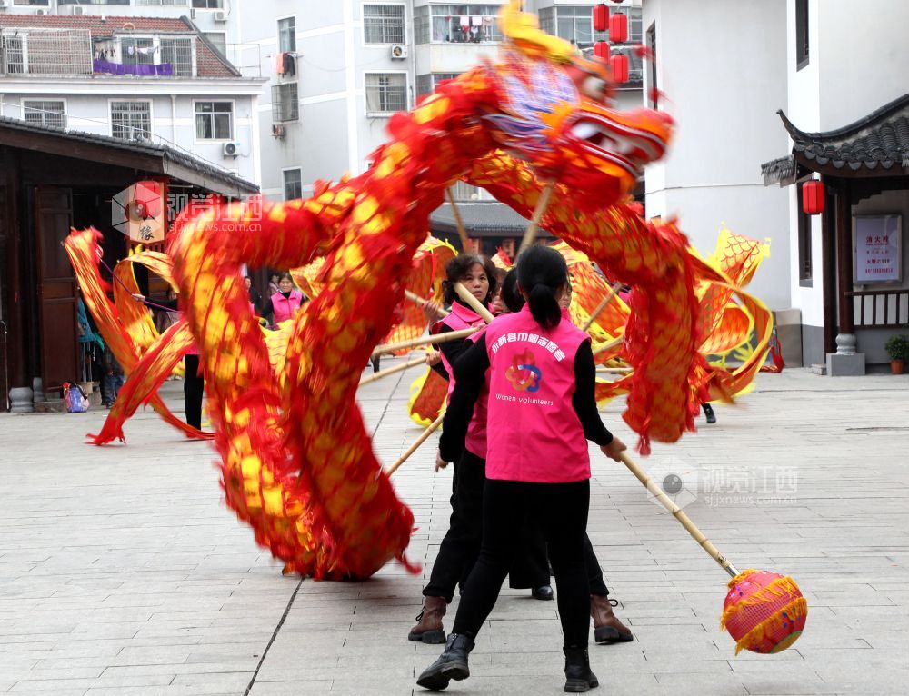 1月28日,在江西省永新县禾川镇秀水坊美食街,由该县巾帼志愿者协会组成的多支女子舞龙队在向市民献上精彩的舞龙表演,喜迎新春佳节到来。