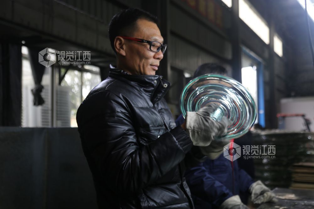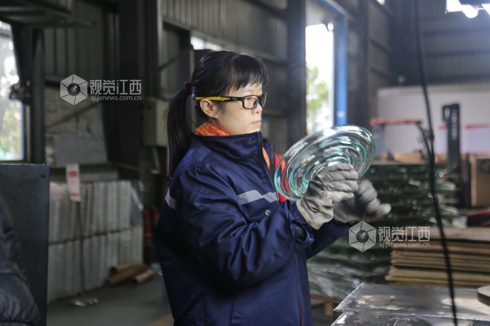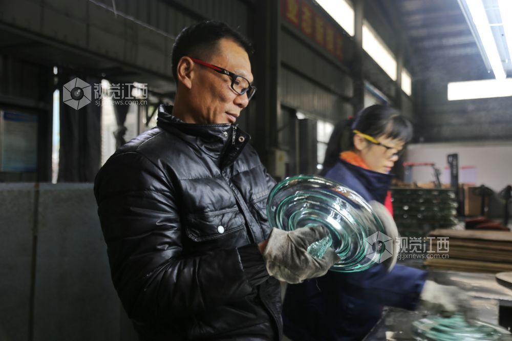 2022年1月30日,江西省萍乡市芦溪县泉新电气有限公司,工人们正在车间里生产玻璃绝缘子产品。