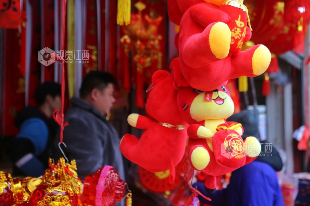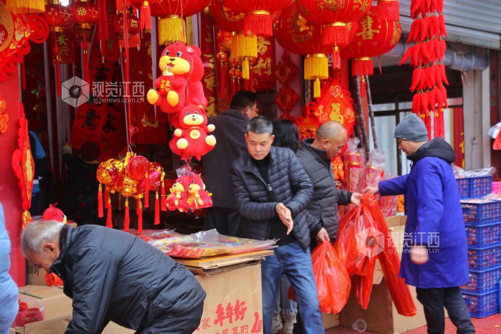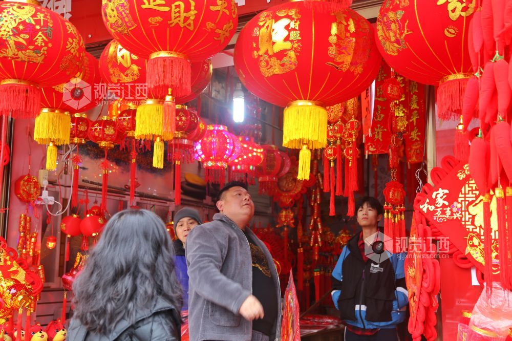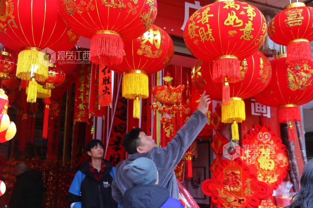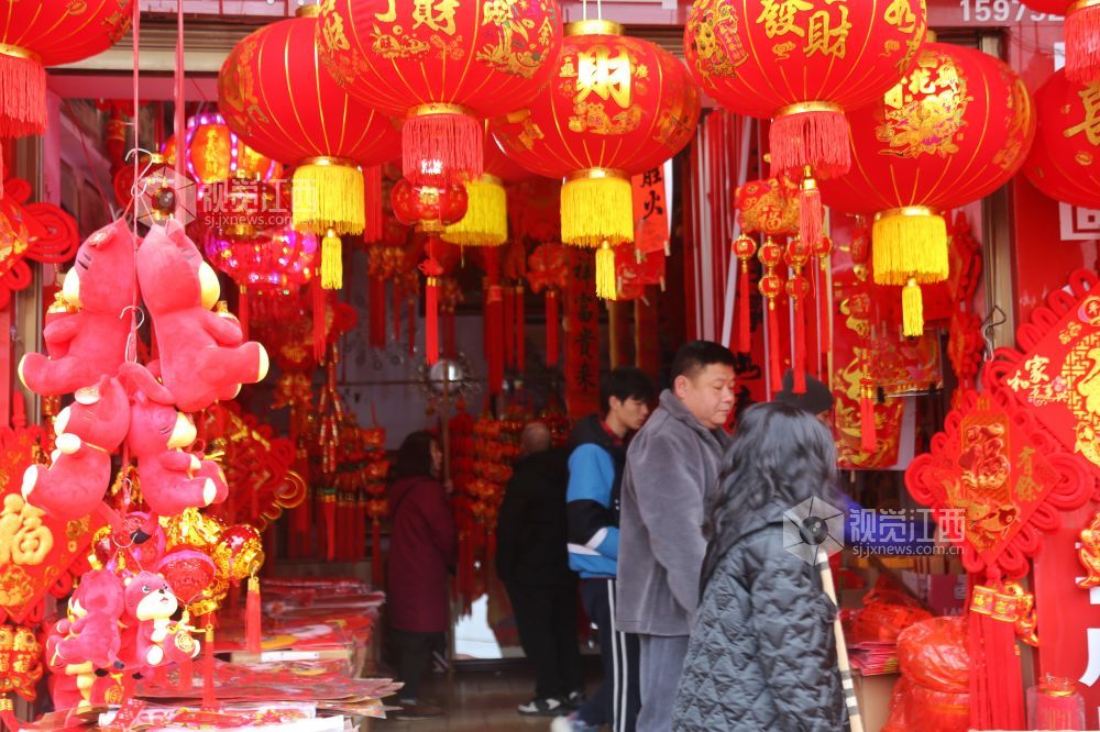 2022年1月30日,春节将至,江西省萍乡市芦溪县年货市场红红火火,人们纷纷选购福字、春联、灯笼、窗花等新春饰品,迎接新春佳节。