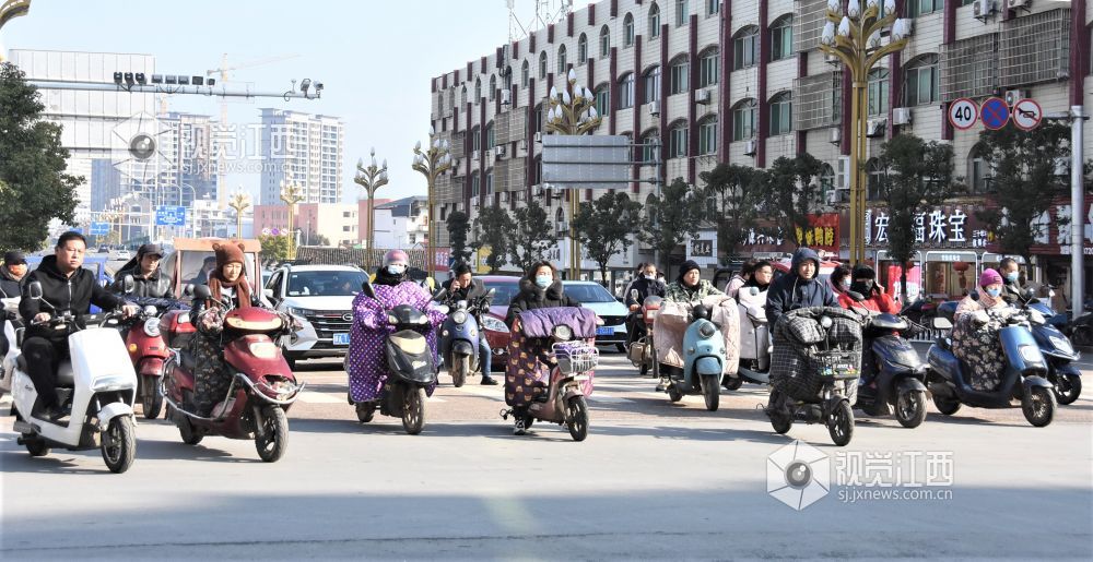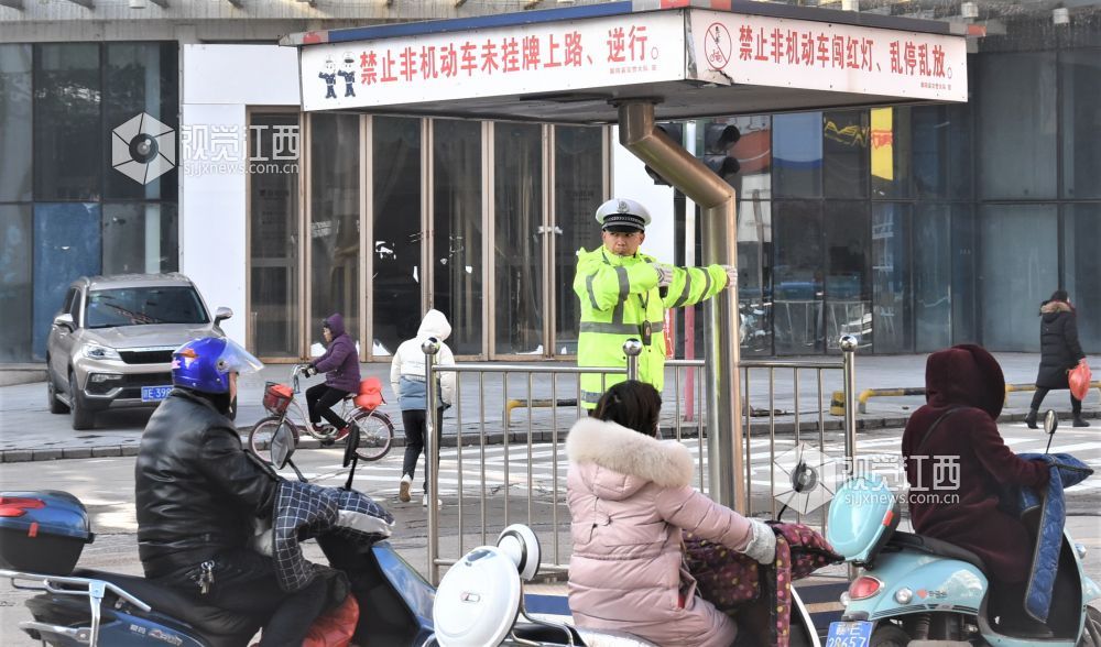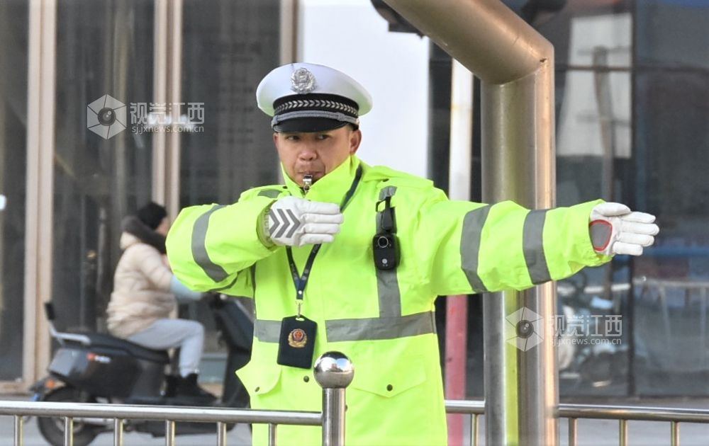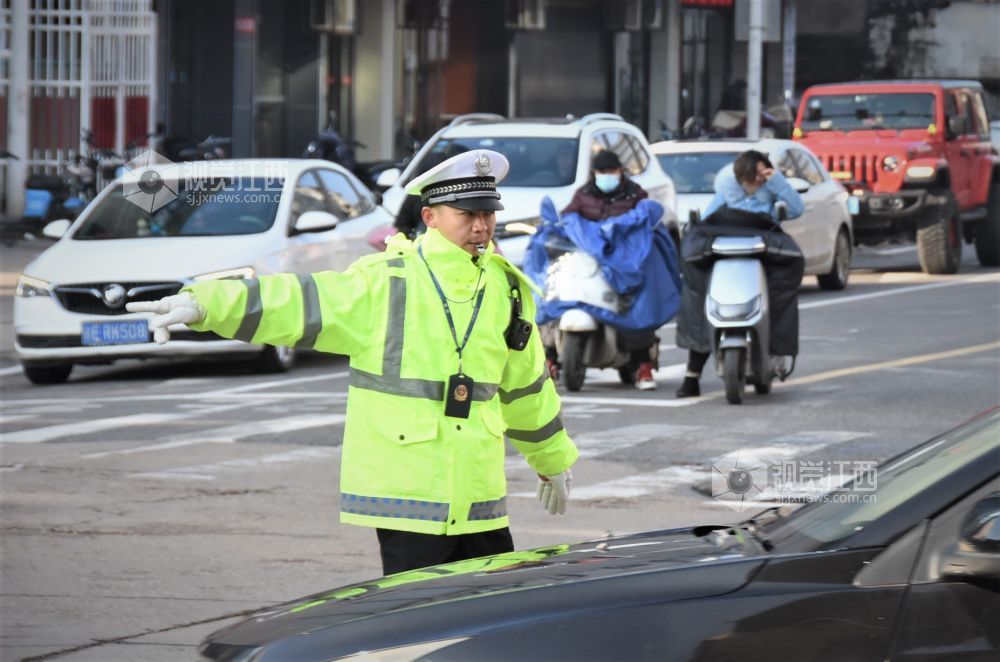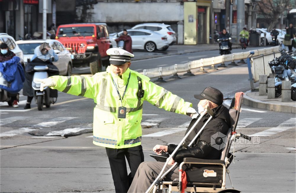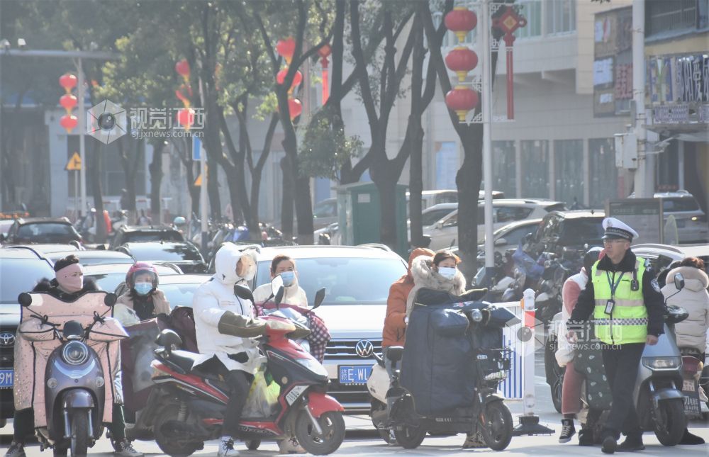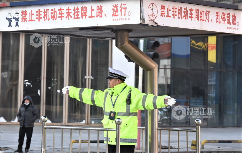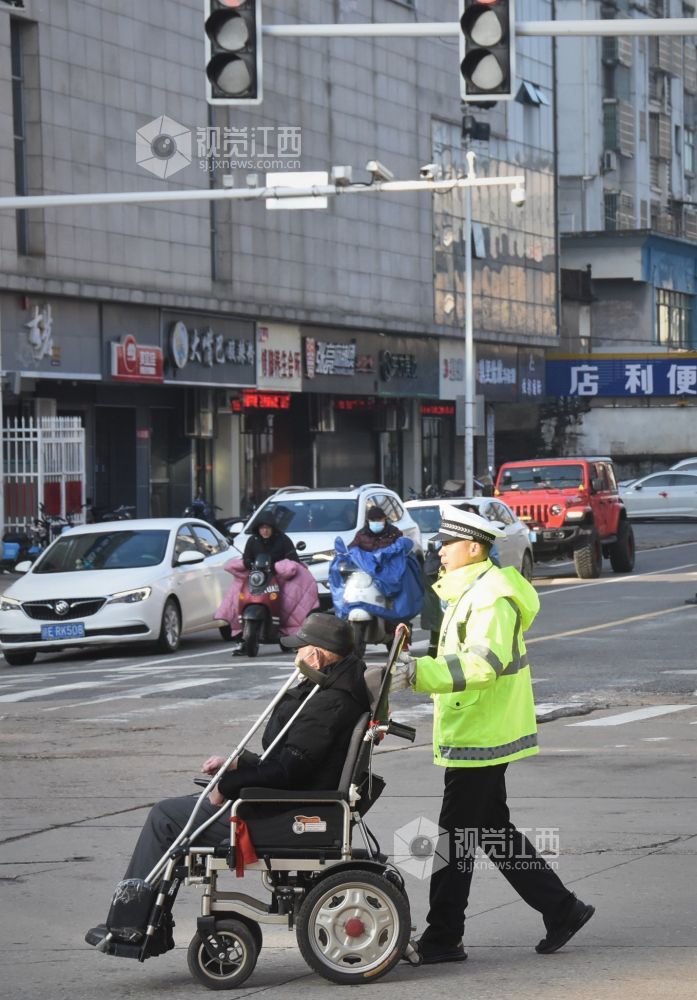 2022年1月30日,江西省鄱阳县县城各主要路段行人车辆增多,车水马龙,坚守在执勤岗位的交警正在忙碌认真指挥疏导交通,帮助残疾老人过马路,市民连声赞道。