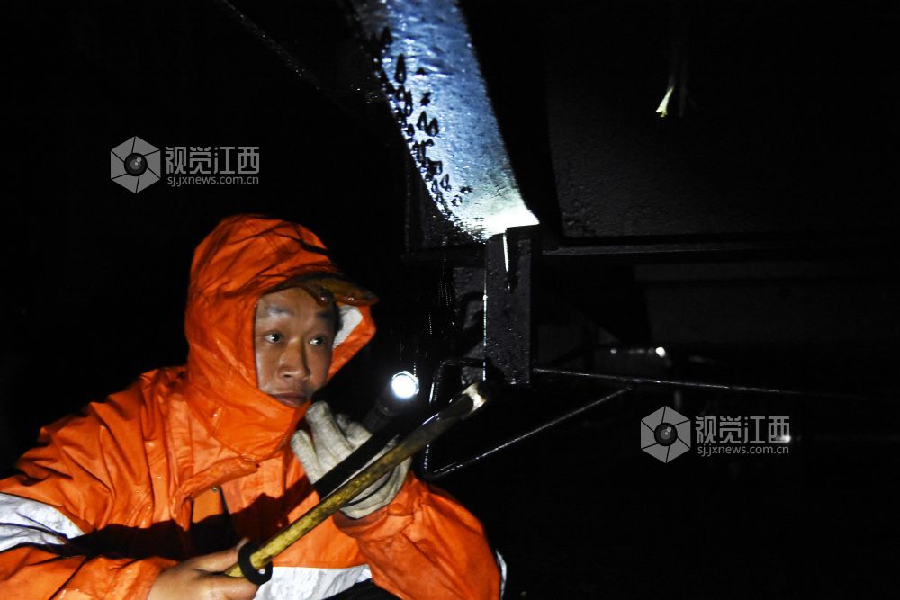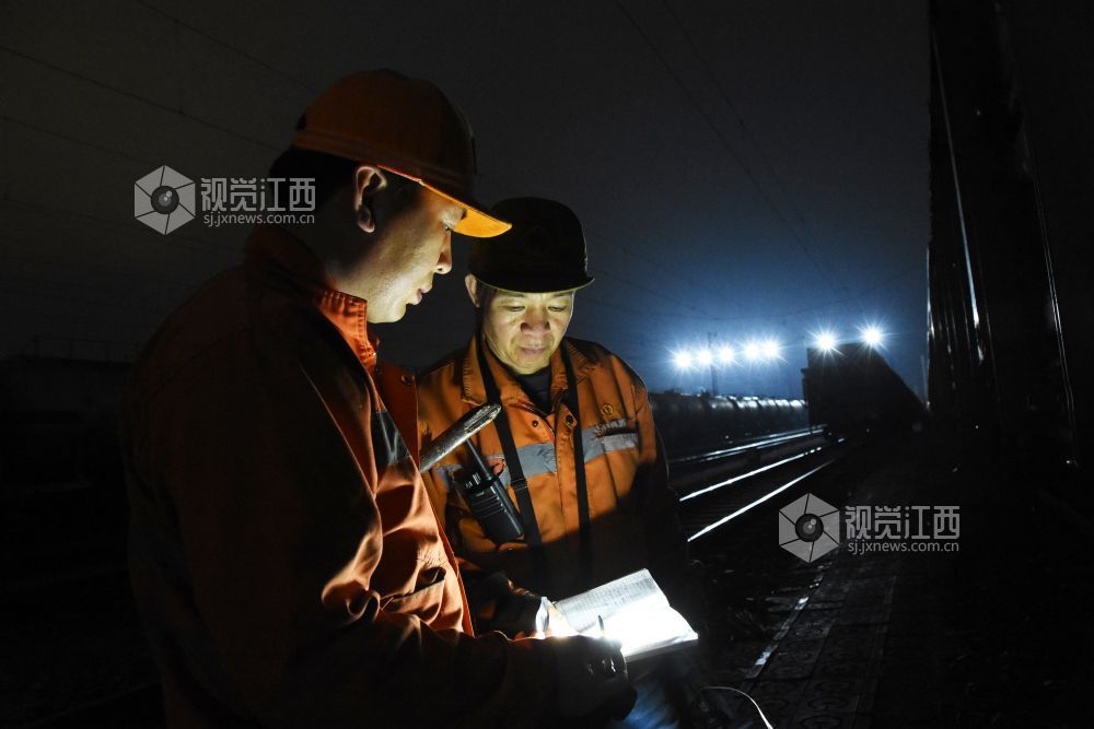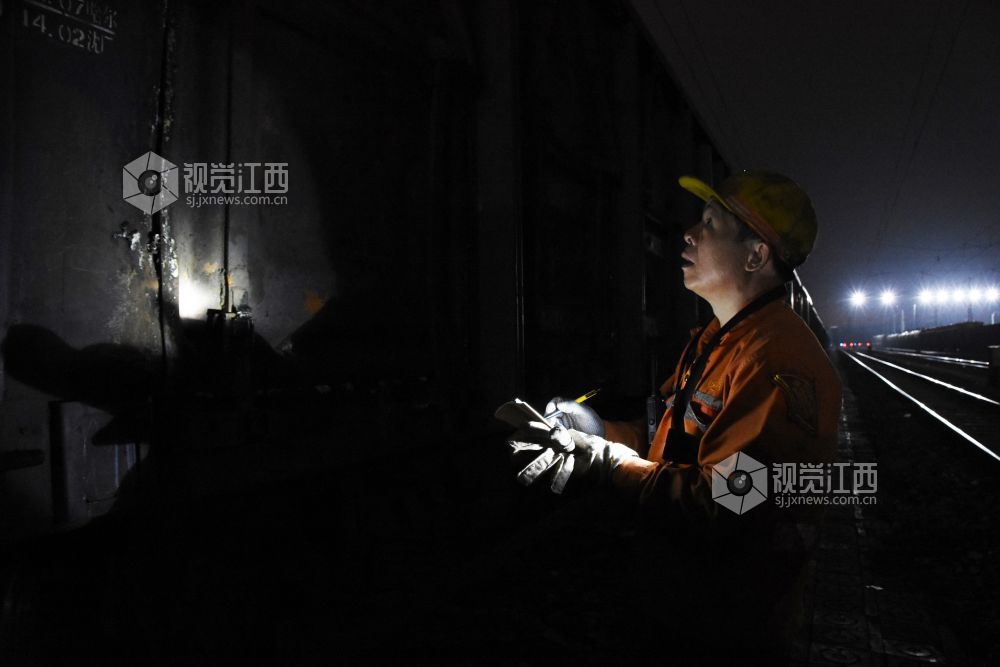 1月31日,除夕夜,南昌南车辆段的“车辆大夫”——货车检车员坚守岗位,为南来北往的火车“问诊把脉”,确保列车安全运行。