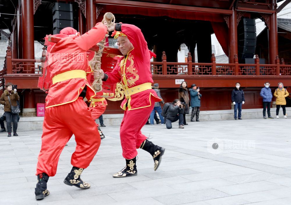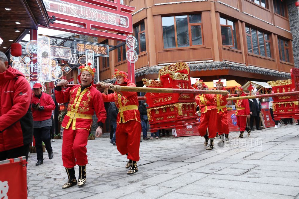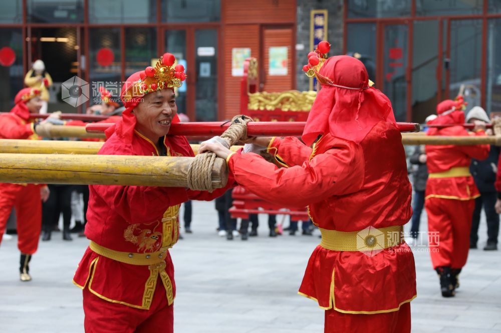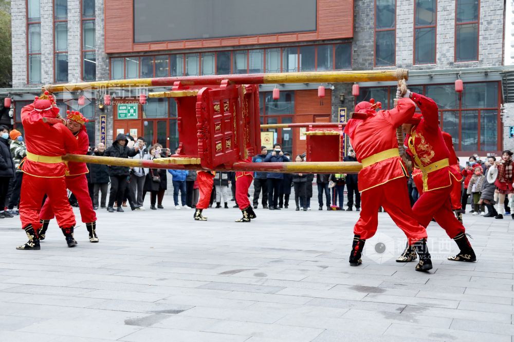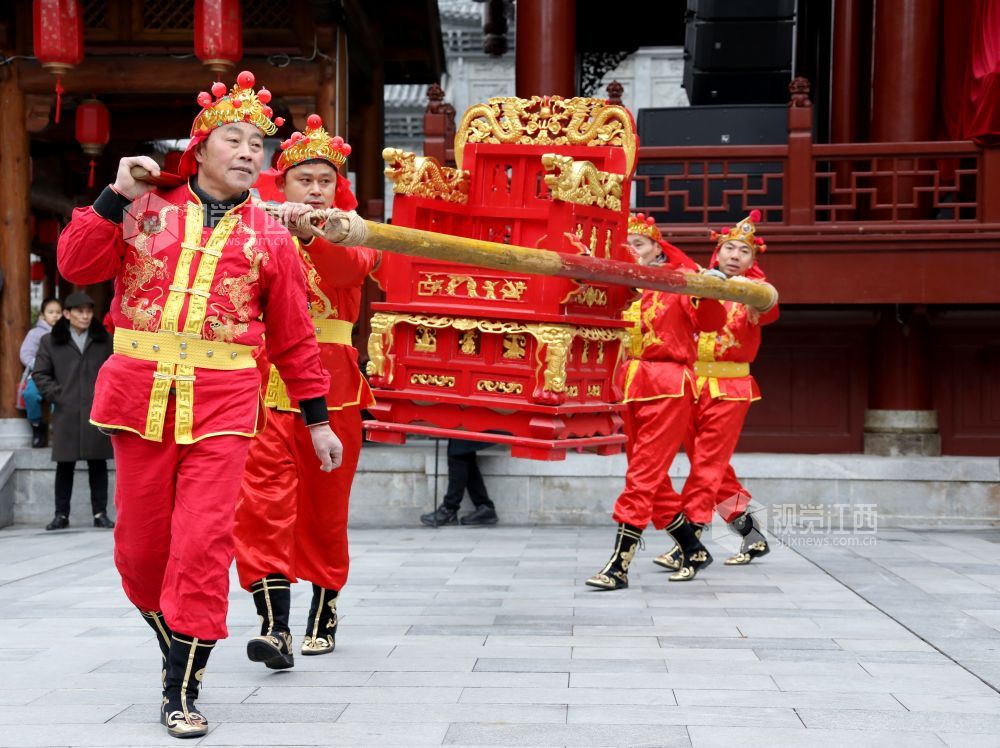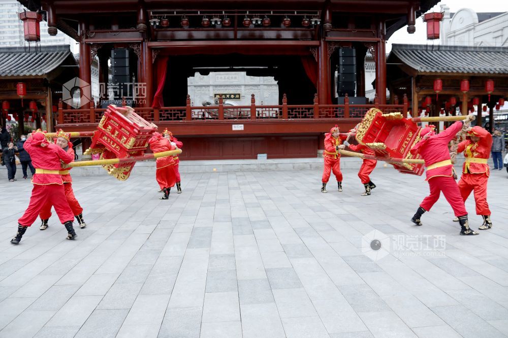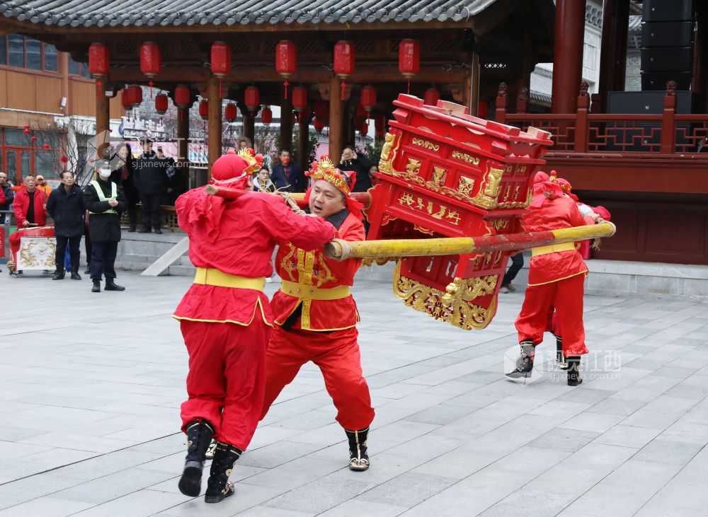 2月3日,虎年春节,在江西省南昌市万寿宫历史文化街区内锣鼓喧天,热闹非凡。江西省非物质文化遗产"北刘轿舞"正在为市民上演一场祈福安康的民俗活动,给节日增添了欢快喜庆氛围。