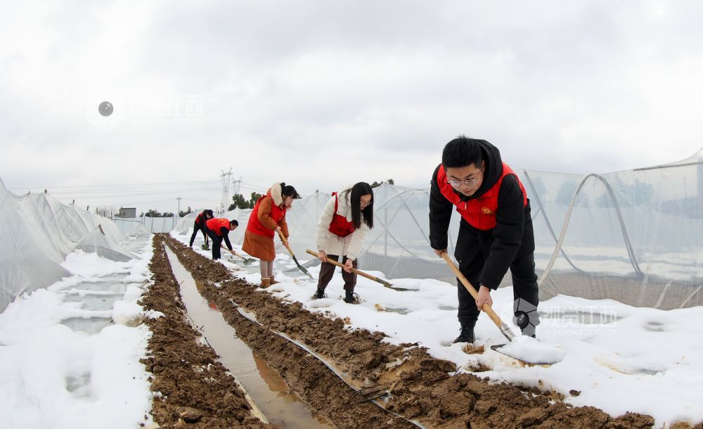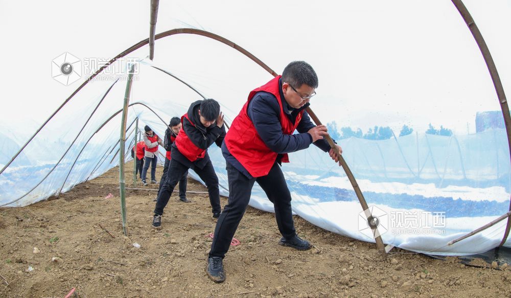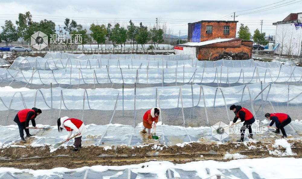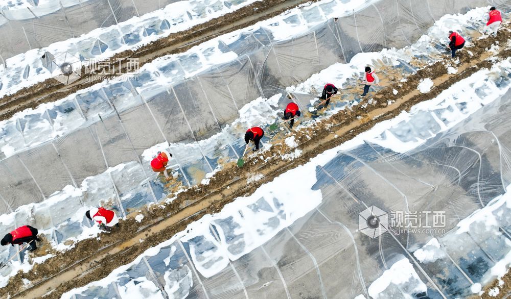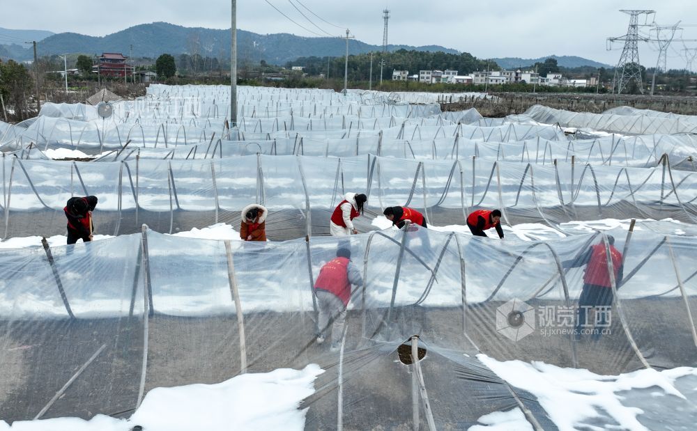 2022年2月9日,江西省瑞昌市高丰镇党员志愿服务队在该镇乐丰村西瓜种植基地为受损的大棚清除积雪、加固整修。