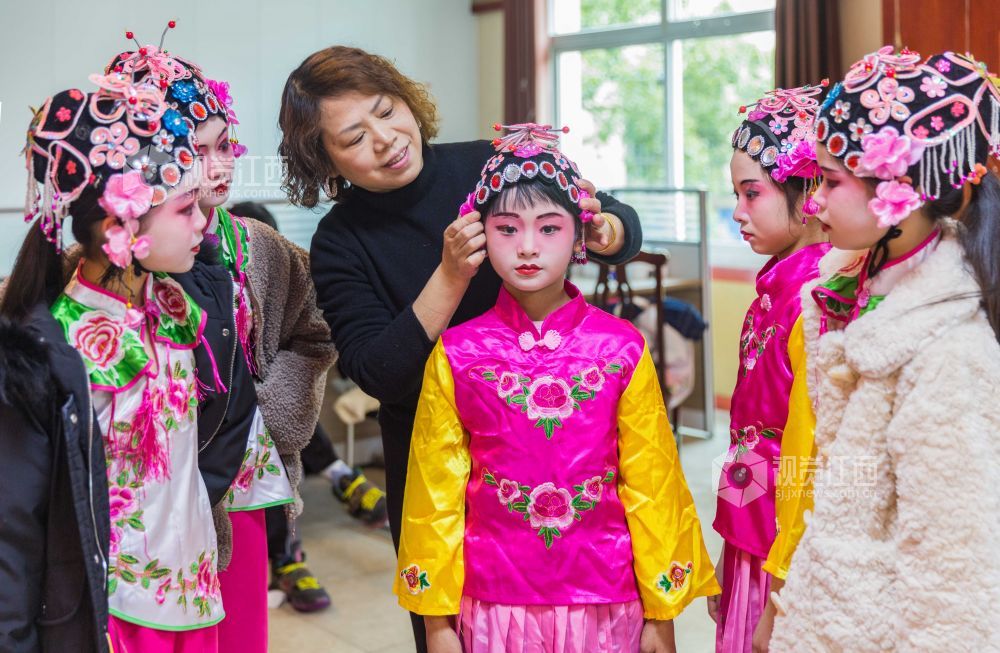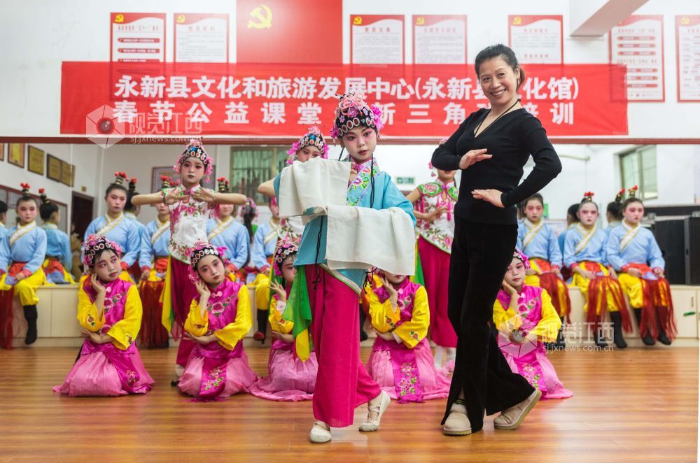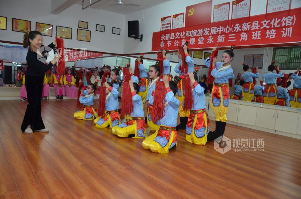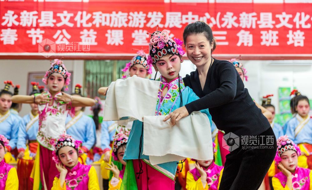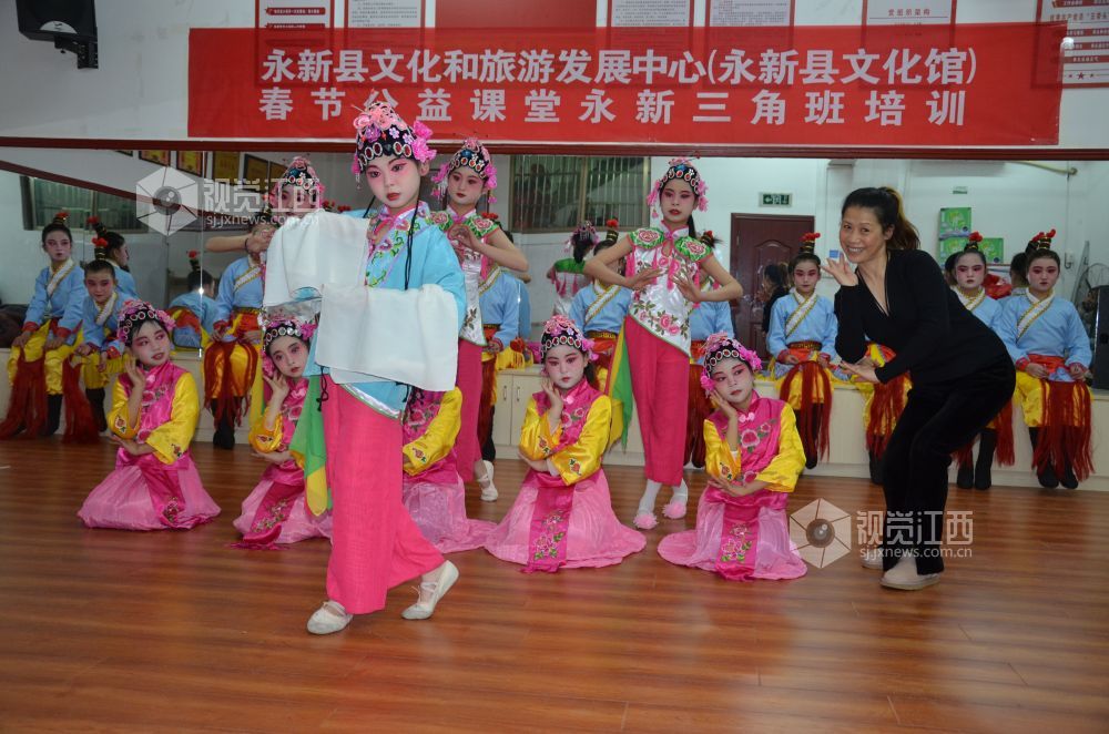 2月9日,江西省永新县文化馆开设三角班戏曲公益课堂。来自该馆的曲艺老师为喜爱三角班戏曲的中小学生传授戏曲表演技艺,让她们零距离感受传统戏曲的魅力,充实孩子们的寒假生活。