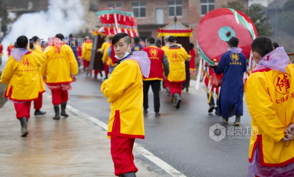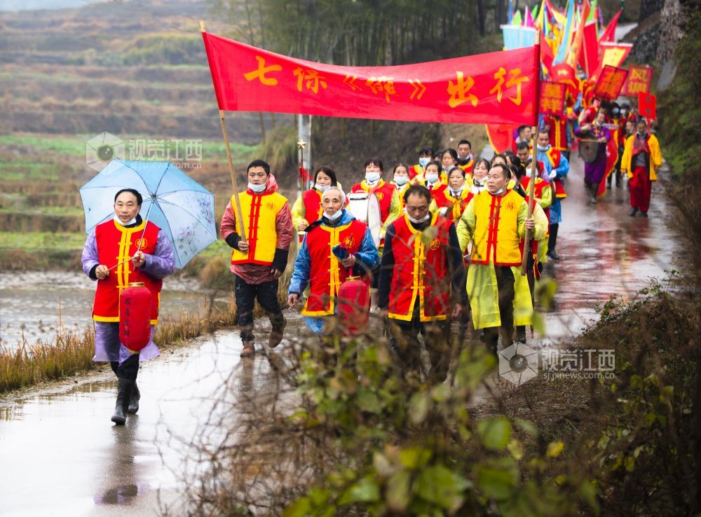 2022年2月7日,江西省萍乡市芦溪县南坑镇七保村以“游傩”的传统形式,走村串户,迎接新年的到来。