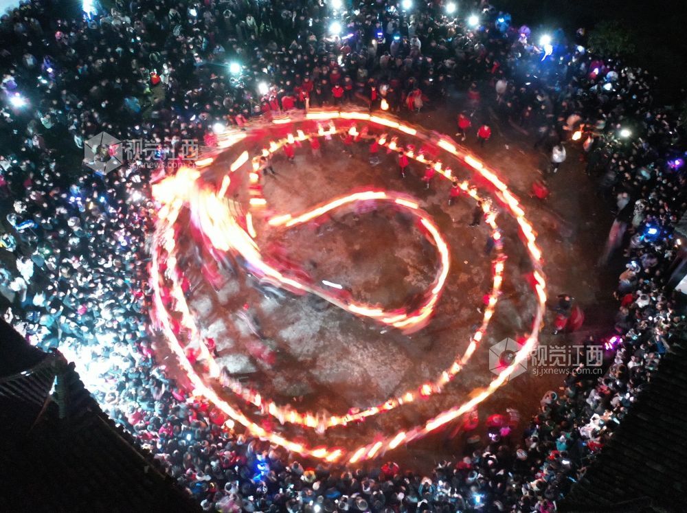 2022年2月14日,江西省上饶市广信区石人乡汪宅村村民,舞起自制百米板凳龙,走村串户汇成“蛟龙”,迎接元宵节的到来。