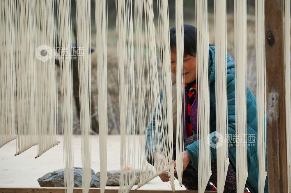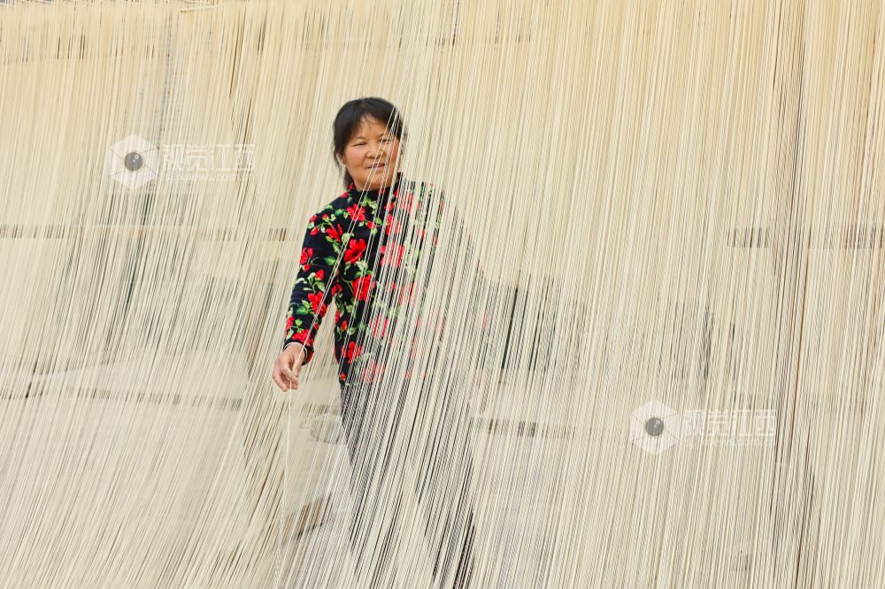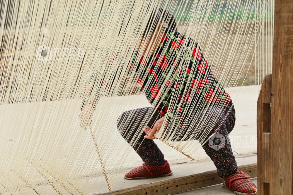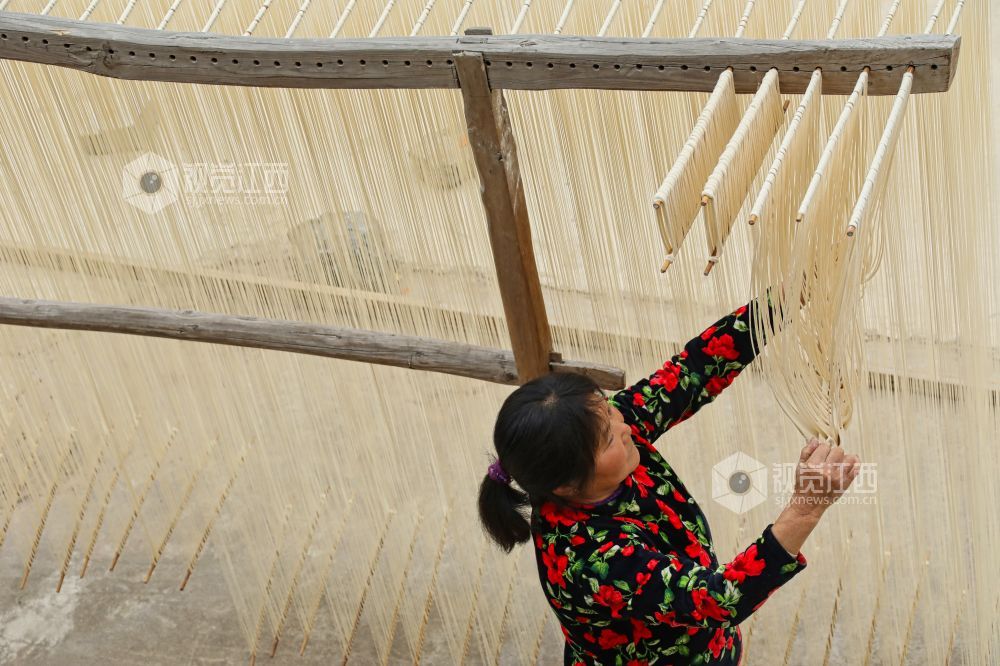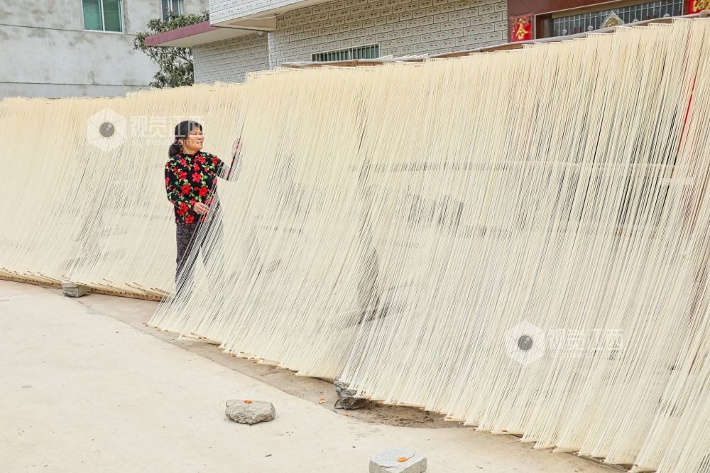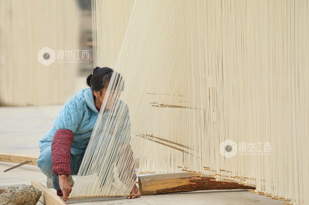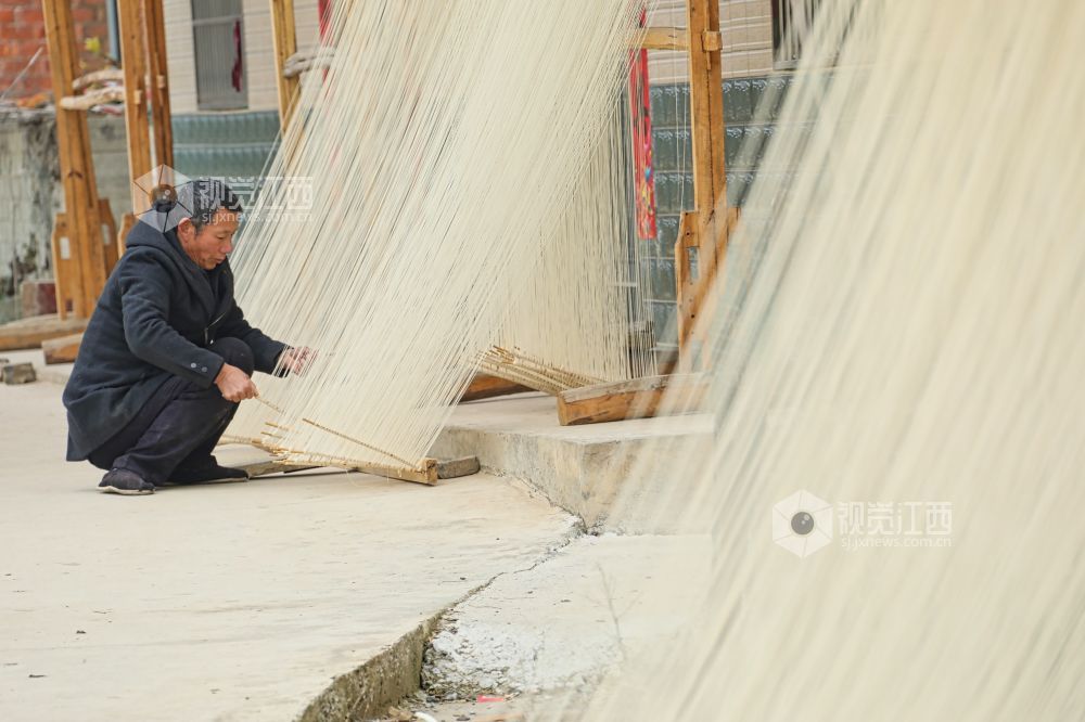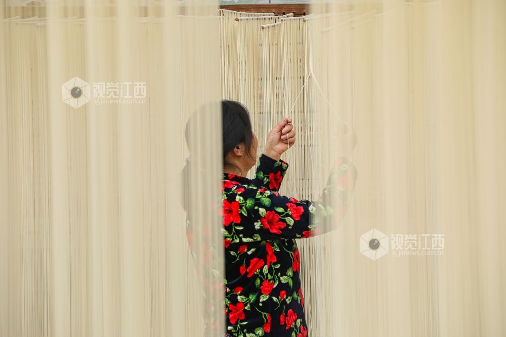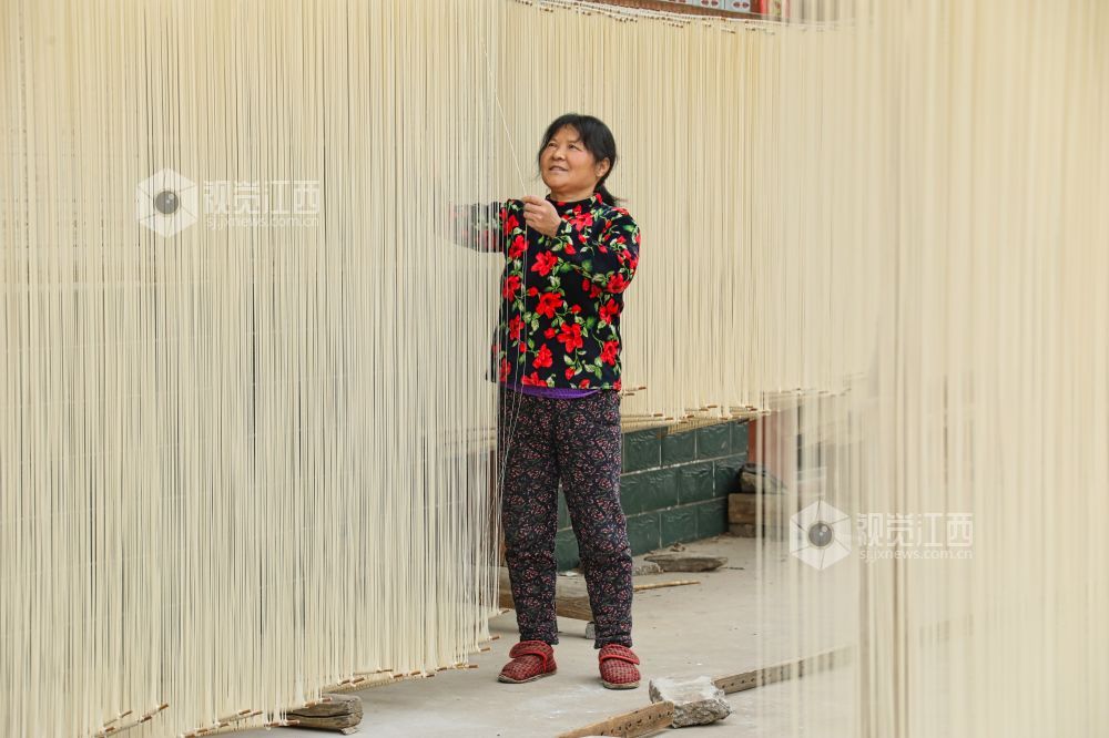 2月26日,江西省九江市都昌县左里镇秦家圈村民正在屋前屋后晾晒手工制作的面条,细细洁白的面条,成为乡村美丽的独特风景。