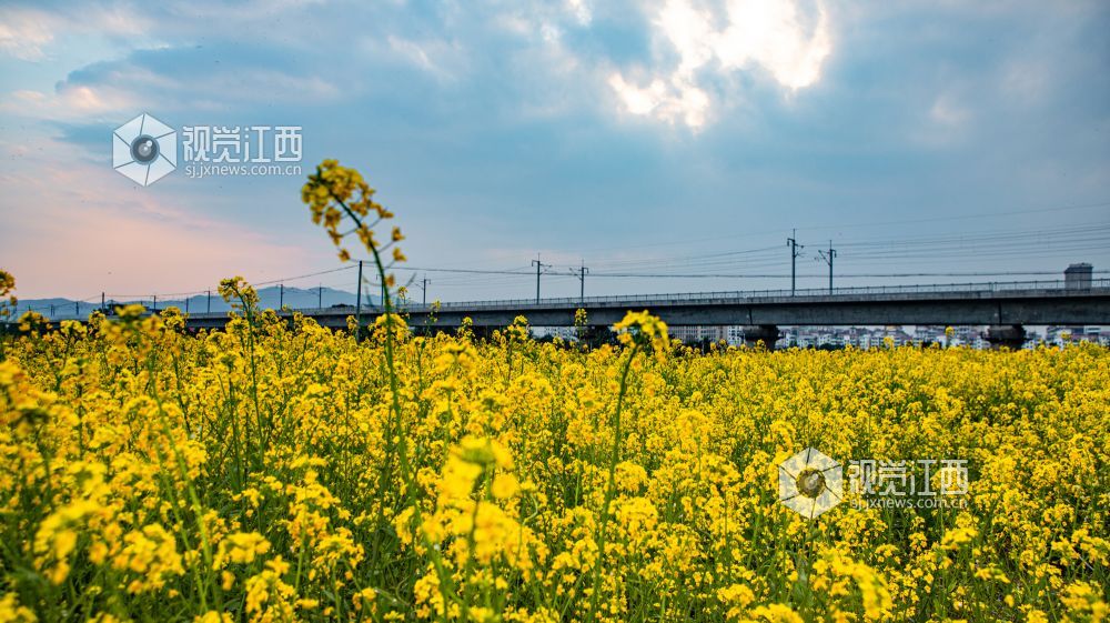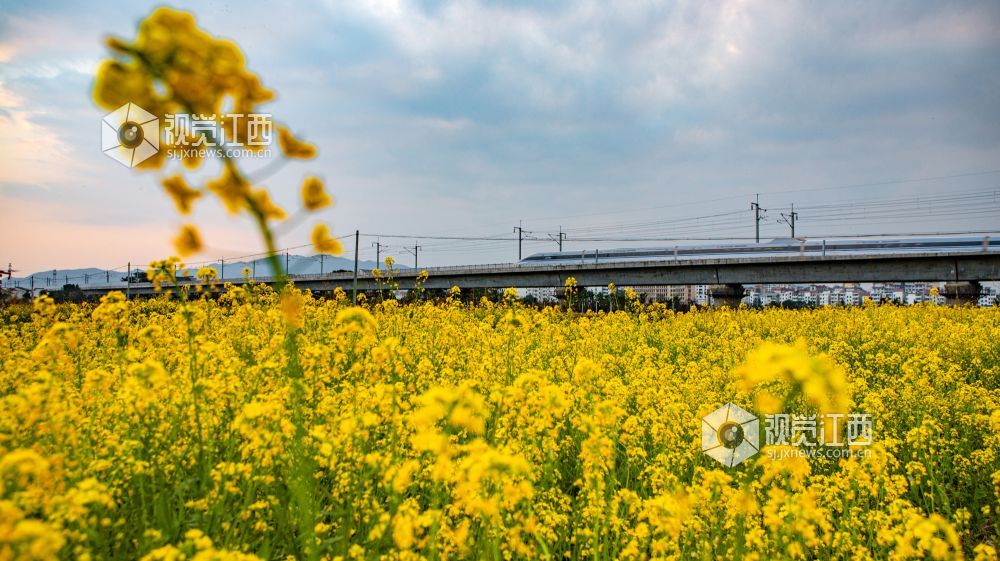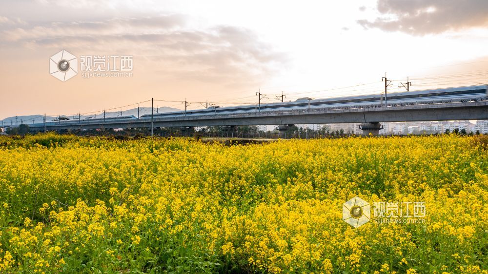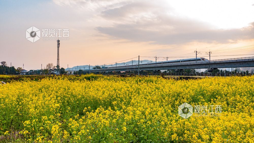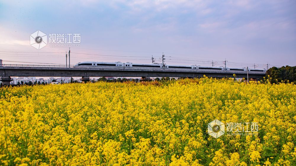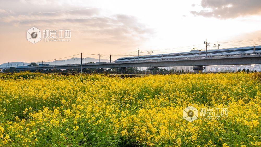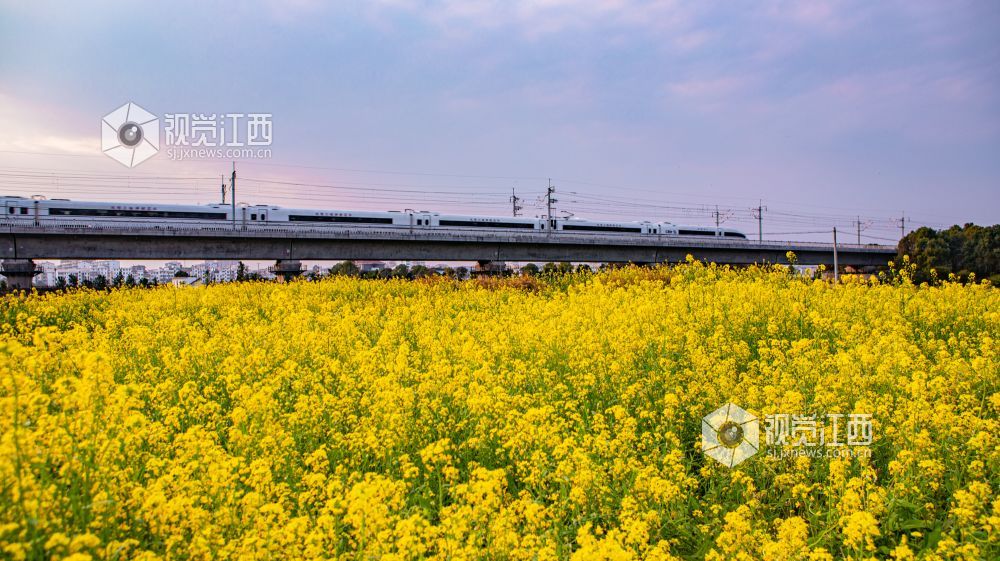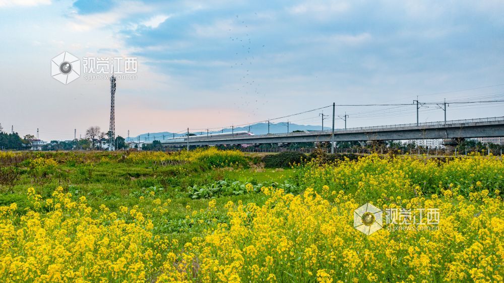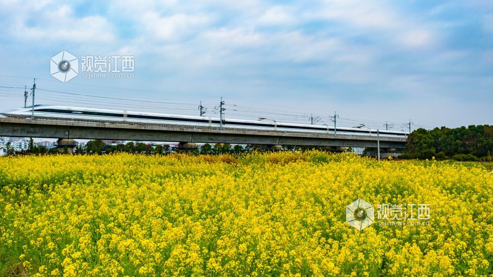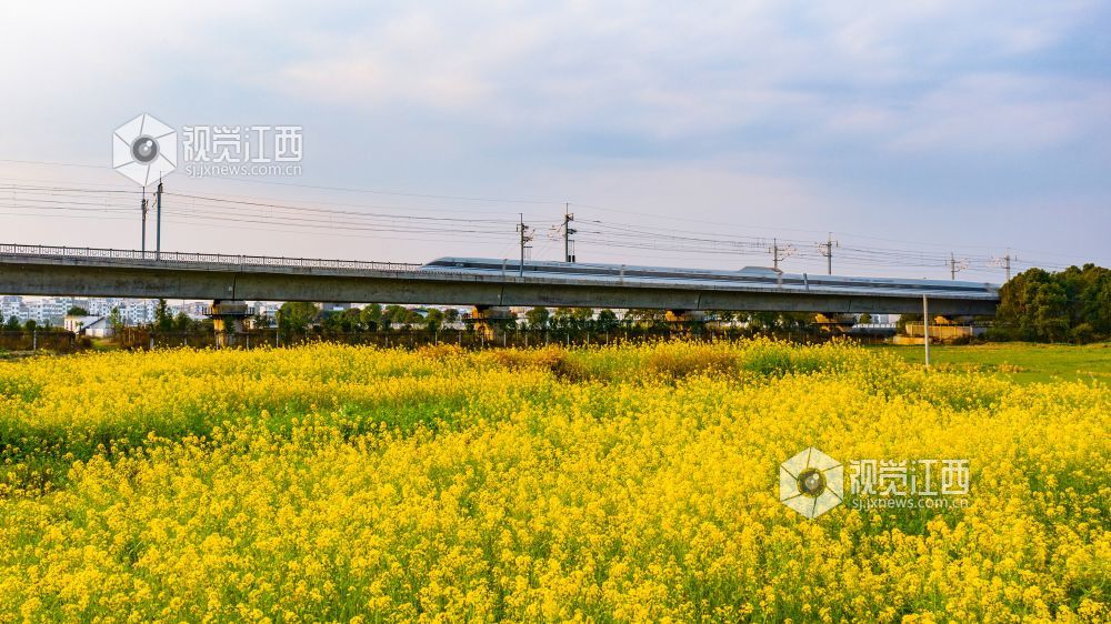 一列列动车组列车在峡江高铁站疾驰而过,穿过一片油菜花海,绿油油的麦田、金灿灿的油菜花连片交织,共同组成一幅多彩的春日美景。