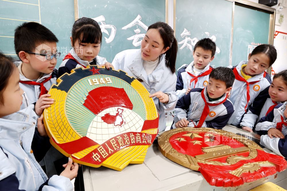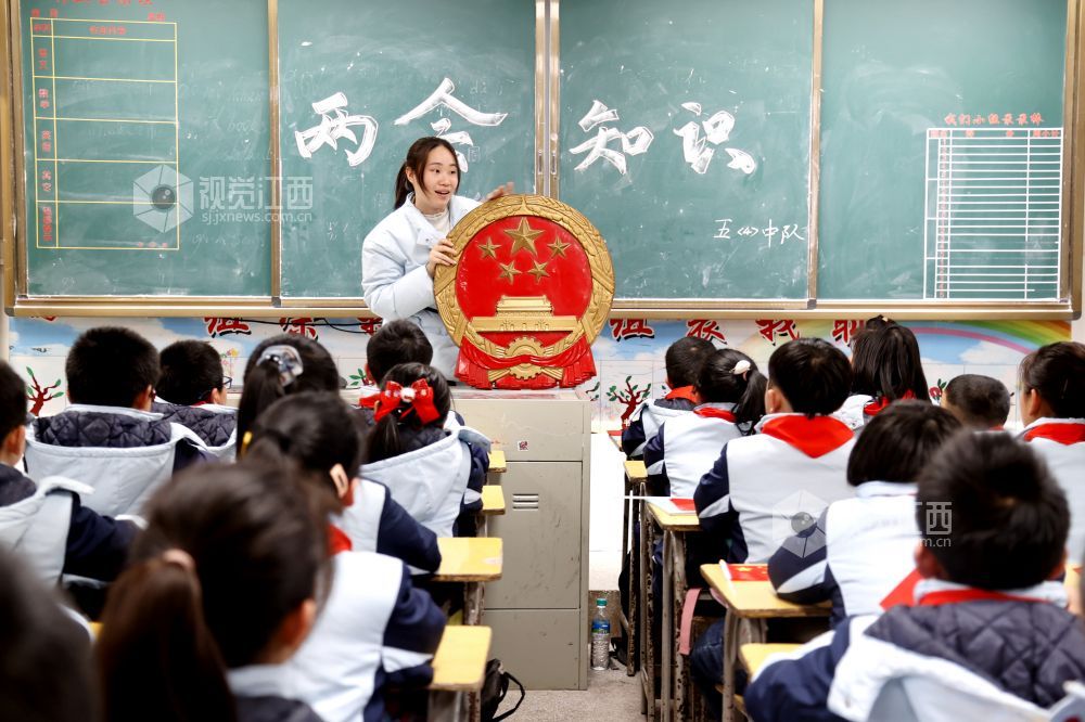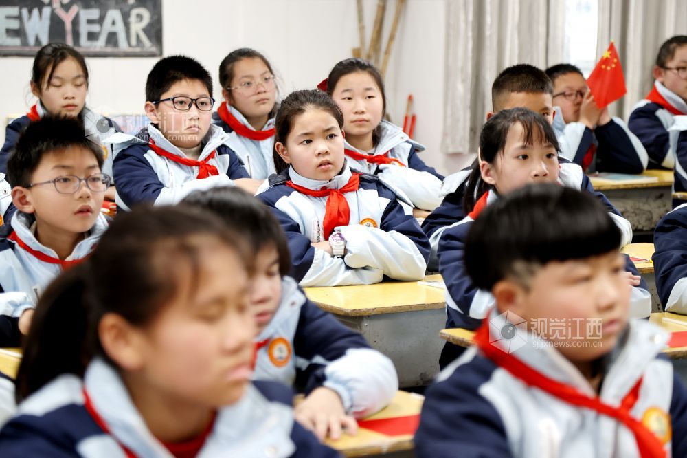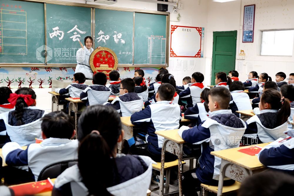 3月1日,在江西省峡江县第一实验小学,学生在课堂上学习有关两会的知识。