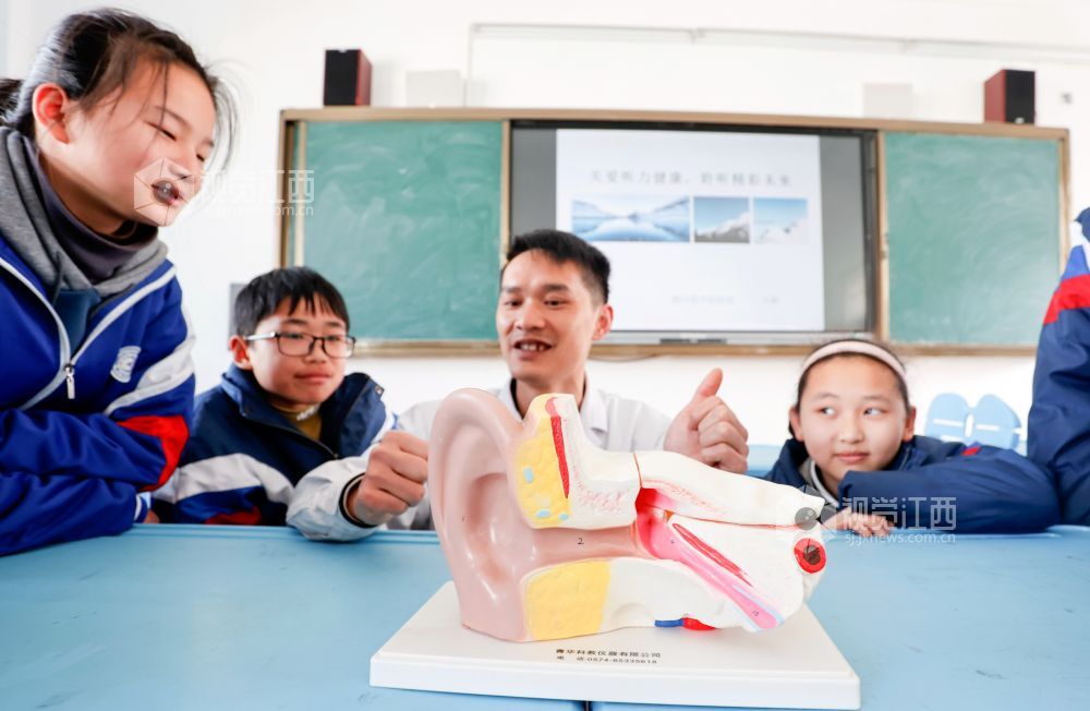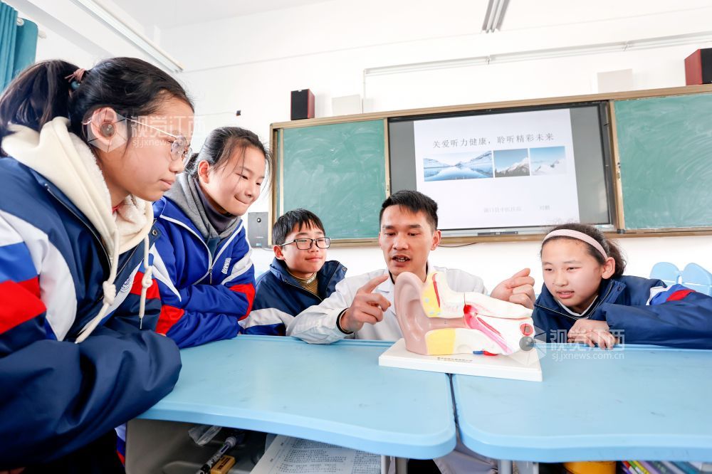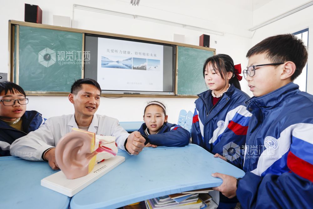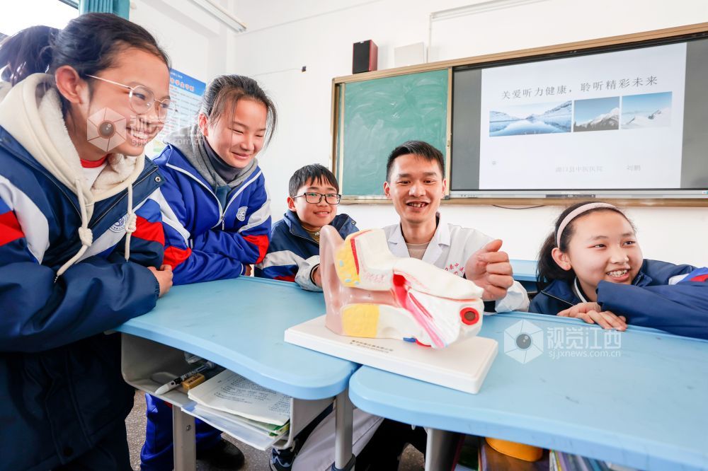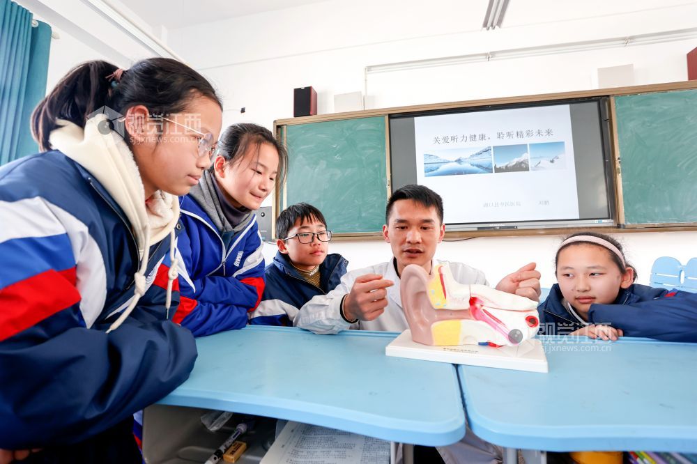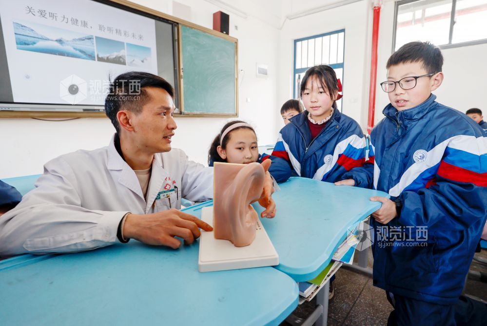 2022年3月2日,江西省九江市湖口县第三中学,湖口县中医医院医护人员为学生们讲解耳朵生理构造和保护耳朵知识。