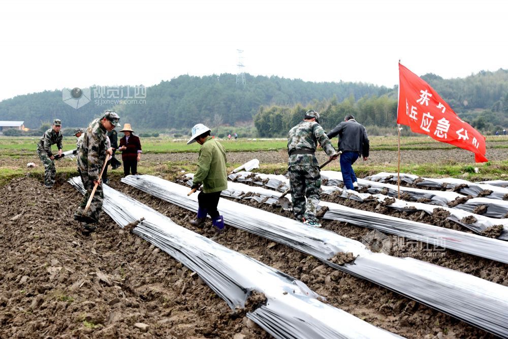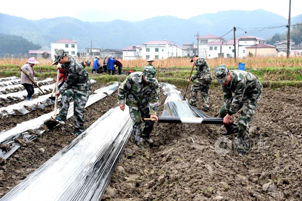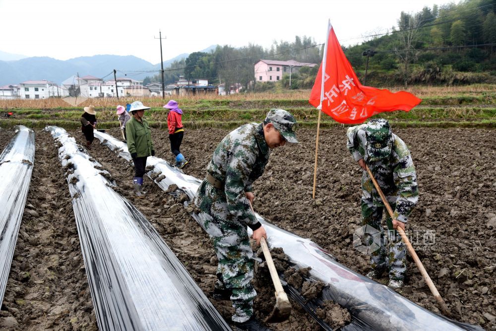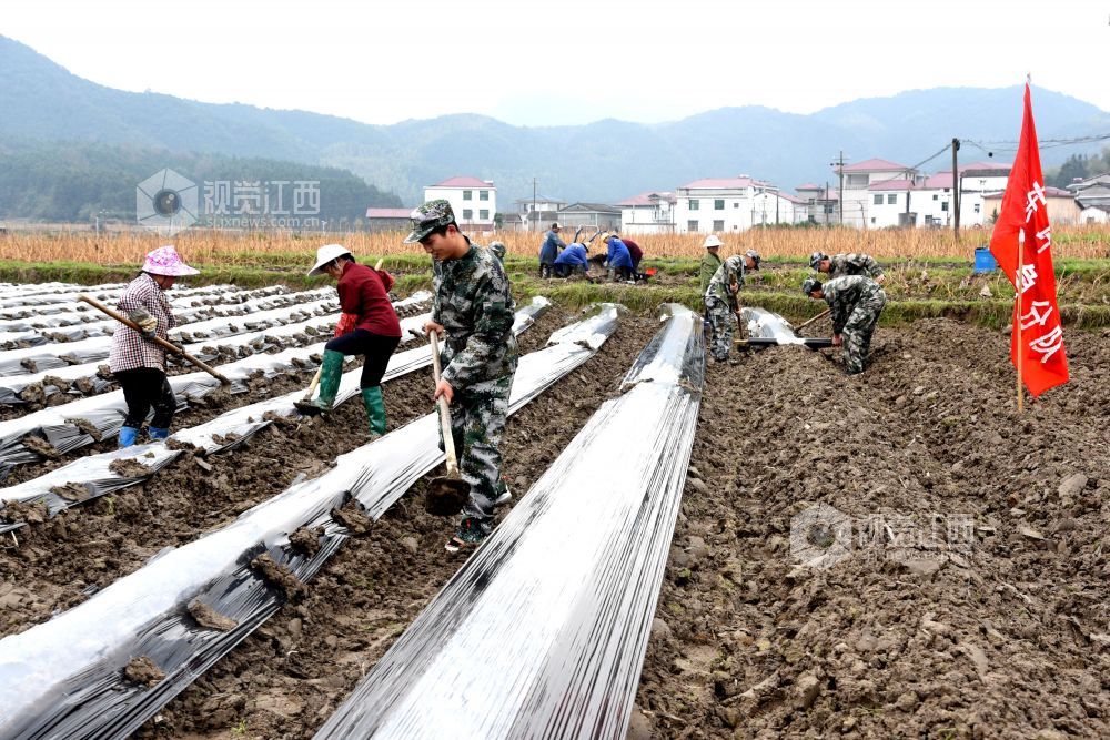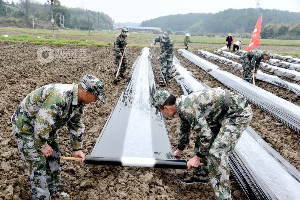 2022年3月4日,江西省抚州市南丰县东坪乡人武部开展“学雷锋爱心助农”活动,组织田溪村民兵应急小分队的民兵们来到田溪村脱贫户和低保户烟田里,起垄、覆盖农膜,为烟叶移栽做好准备。