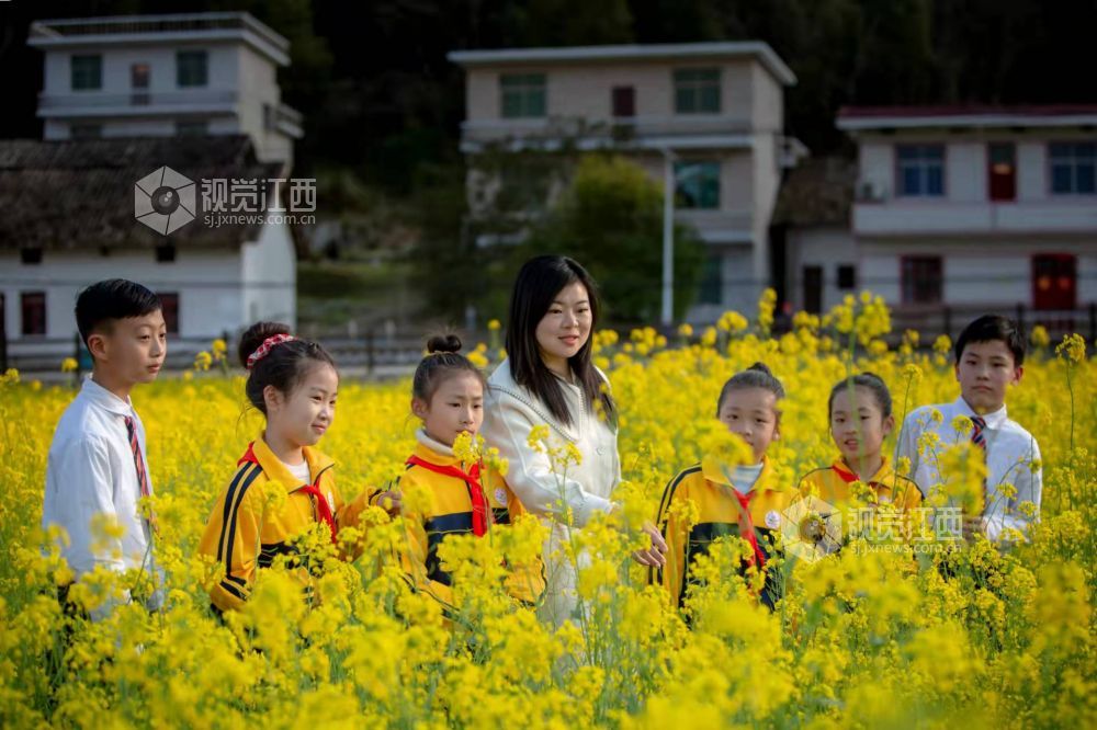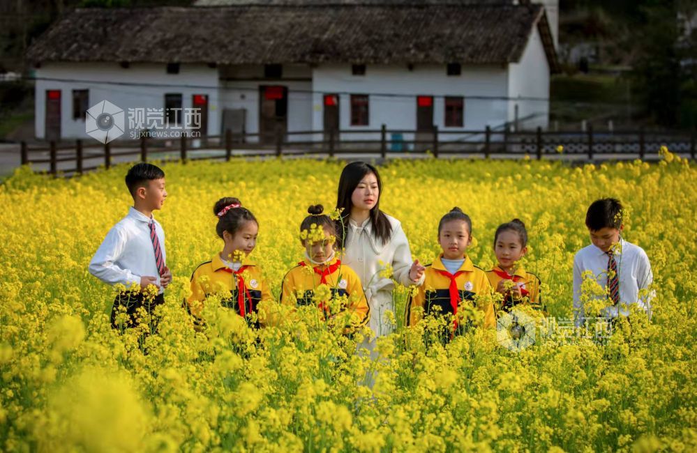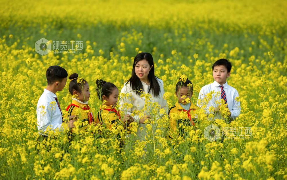 2022年3月7日,阳光明媚,春暖花开,江西省分宜县洞村中心学校的老师带领部分学生来到霞贡村油菜花田,一起寻找花田里的自然秘密,感受春天的魅力,开展劳动实践教育和美育教育。有的老师向学生讲解油菜的生长规律以及油菜的价值、油菜花的形状等,有的老师带领学生在油菜花海里荡漾,有的老师在花海里演奏一曲春天的赞歌。