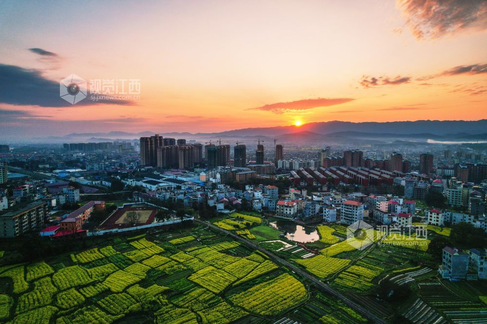 3月10日清晨,旭日东升,江西省永新县在晨曦的照耀下,山水田园与城乡建筑交相辉映,绘就了一幅现代化城市与自然优美的田园风光相得益彰、城乡融合发展的新图景。