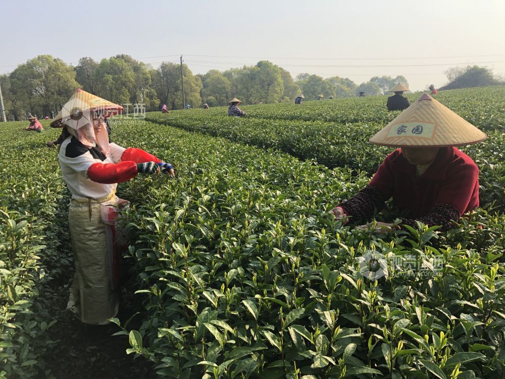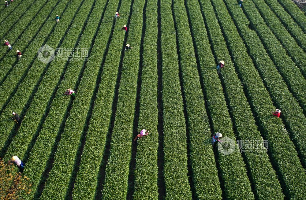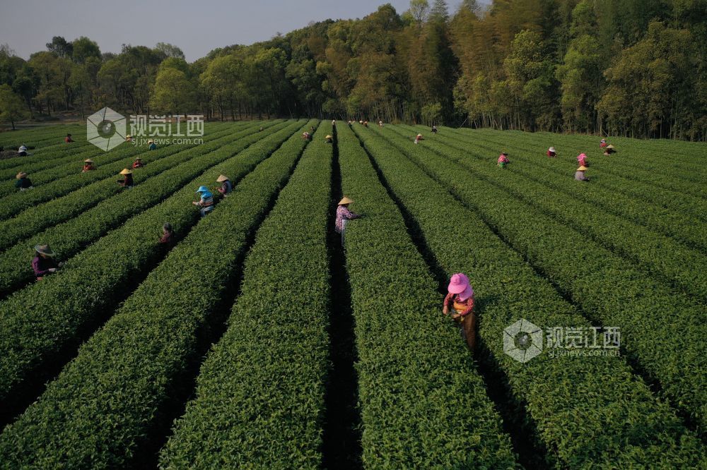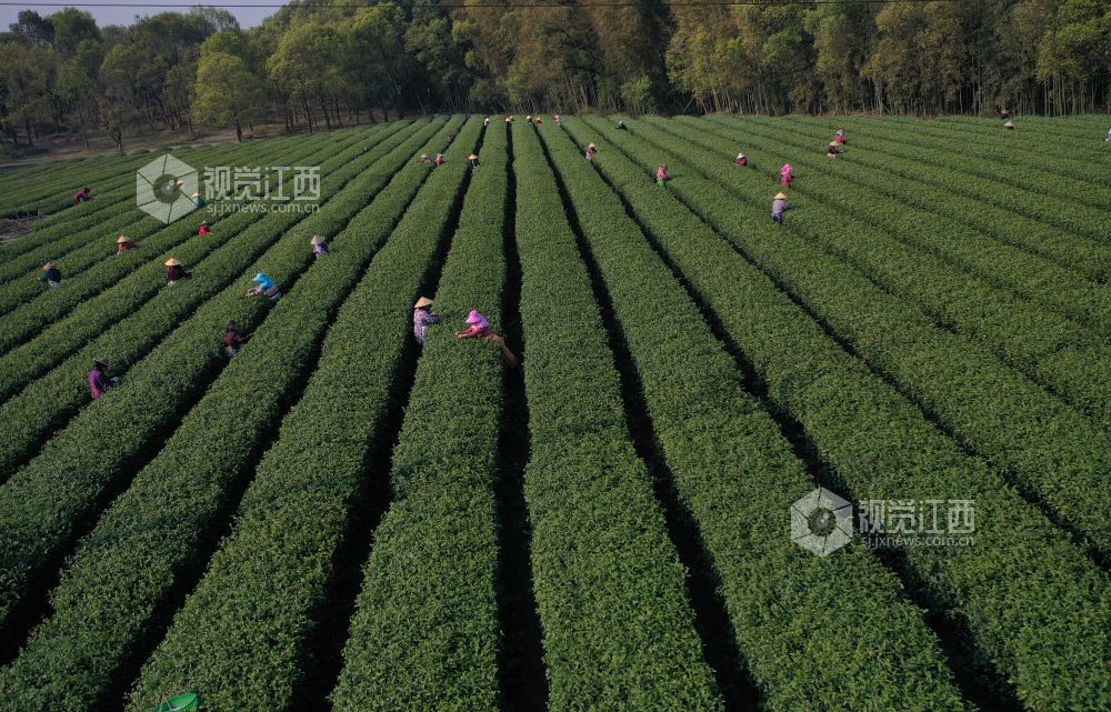 2022年3月14日,随着气温回升,各地春茶陆续开采。这是位于江西省上饶经开区董团乡境内的一茶叶基地,茶农们抓紧时间采摘春茶,忙碌的身影犹如律动的音符,奏响春天的乐章。