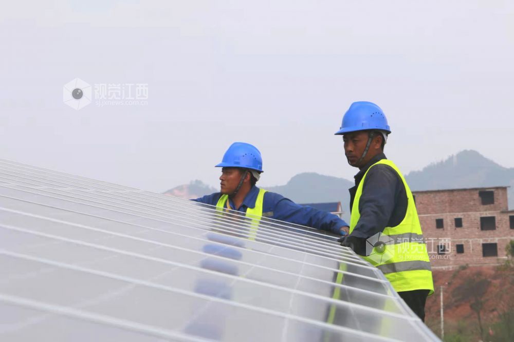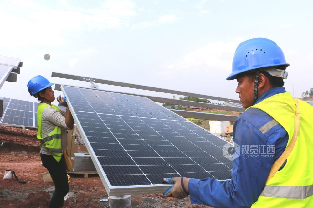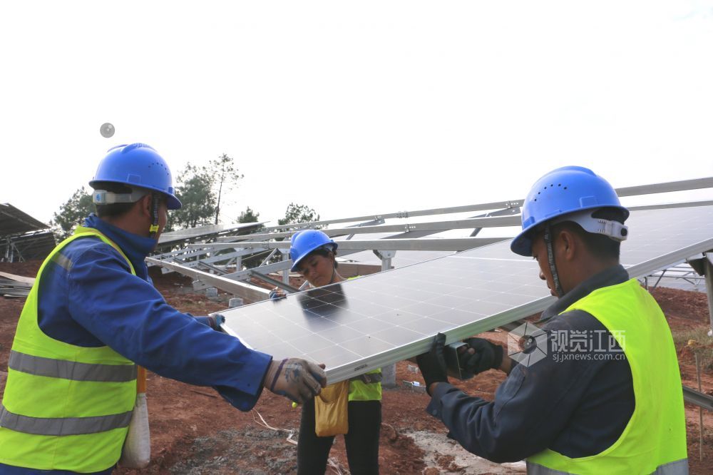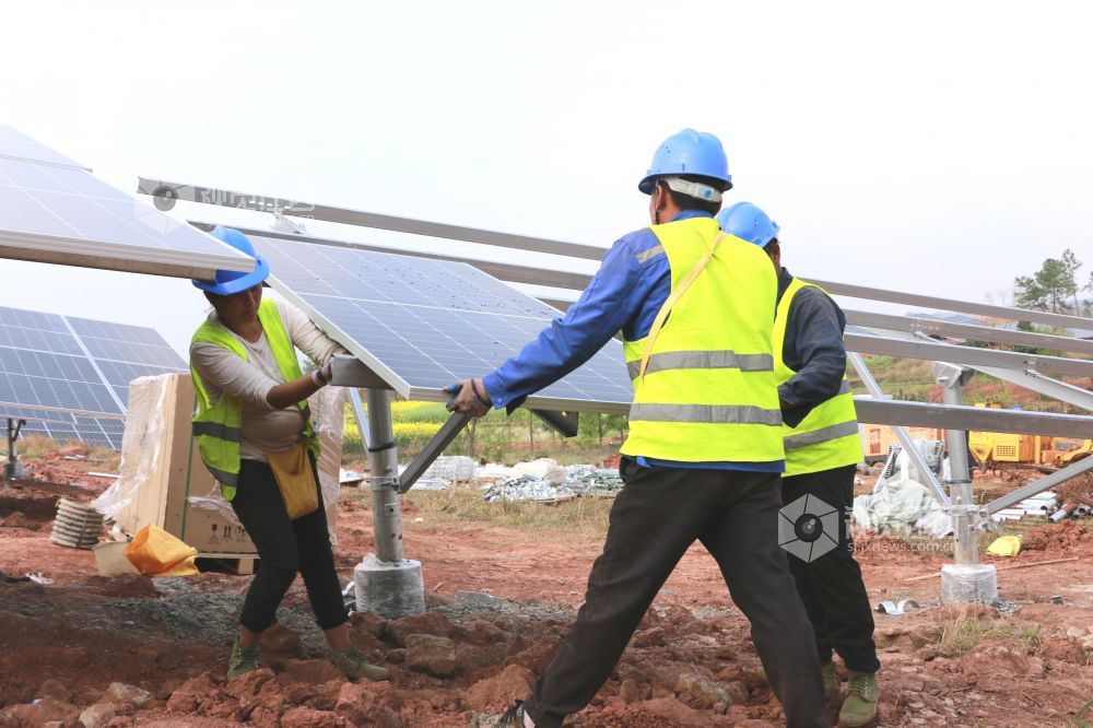 3月14日,在江西省永新县莲洲乡双湖村附近的1800余亩荒山上,一个90兆瓦光伏发电项目正在紧张施工当中。