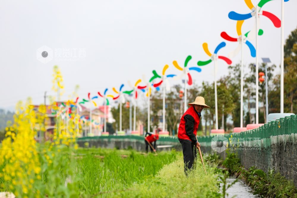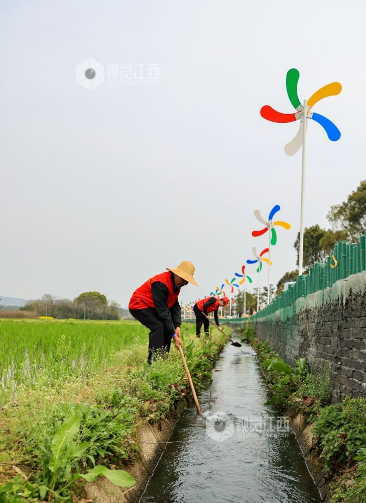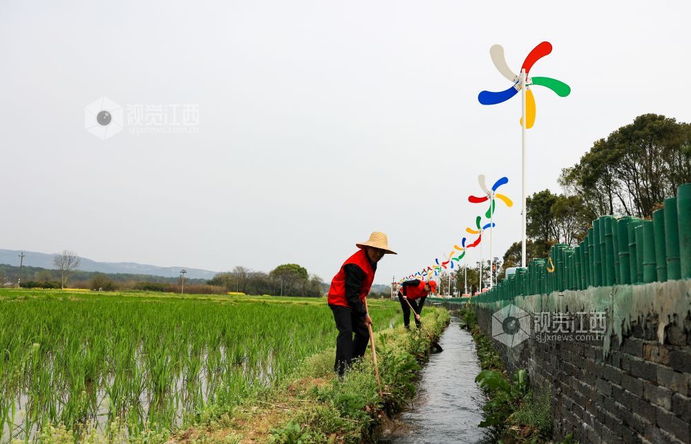 2022年3月16日,江西省瑞昌市范镇良田村党员志愿者在清淤泥、疏水渠,助力当地农事春耕灌溉。