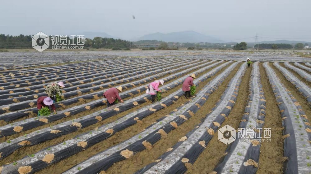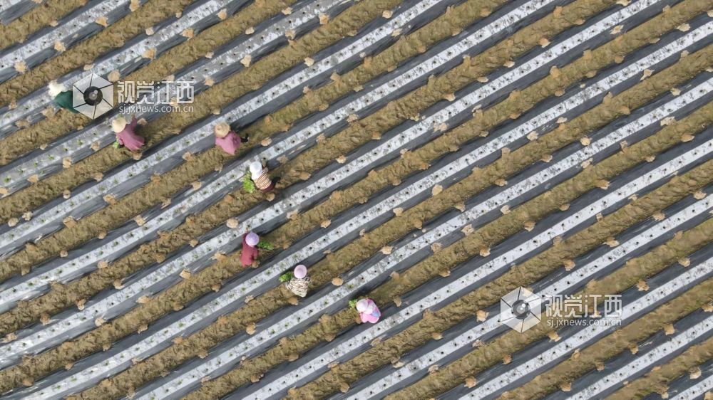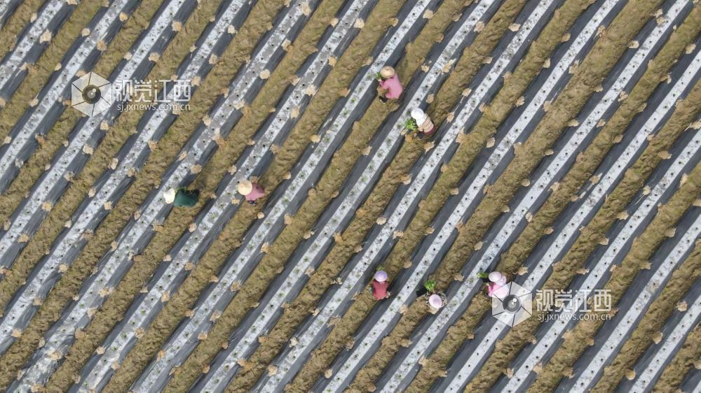 3月16日,在江西省吉安市峡江县马埠镇心田村烟农们正在田间移栽烤烟苗。
