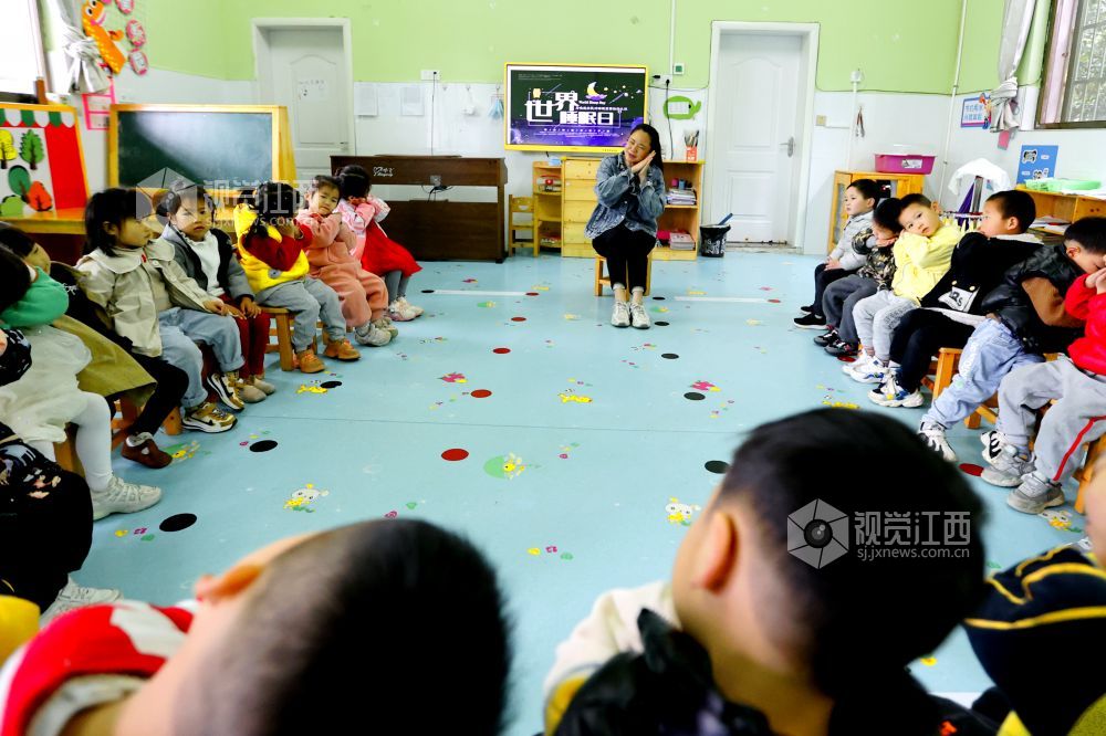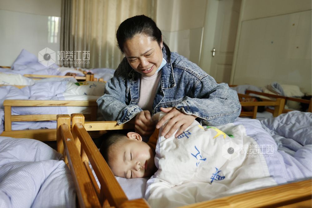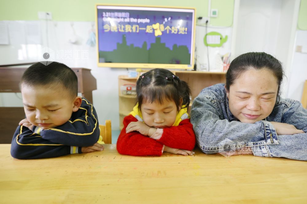 3月18日,江西省吉安市峡江县幼儿园的老师在为小朋友讲解正确的睡眠姿势。