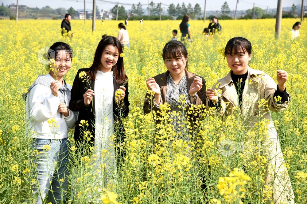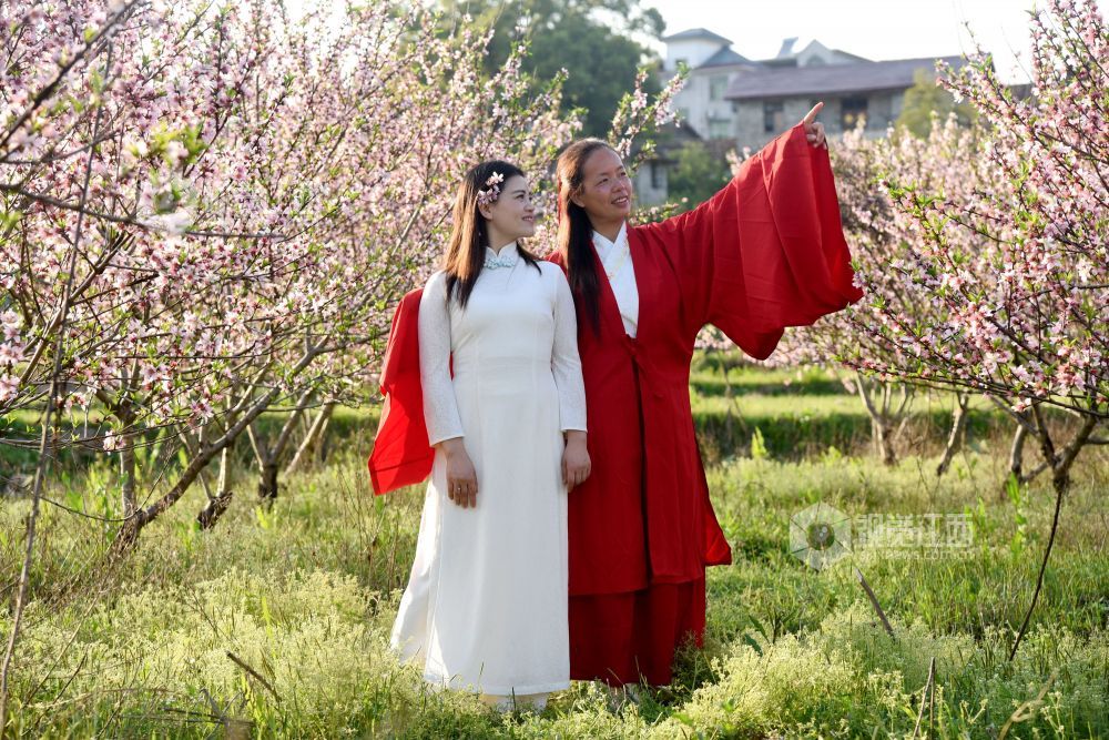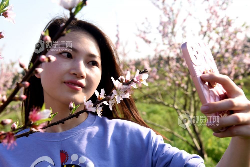 2022年3月19日,江西省南丰县洽湾镇栽种的桃花、油菜花迎春绽放,吸引游客纷至沓来观光、欣赏、拍照。