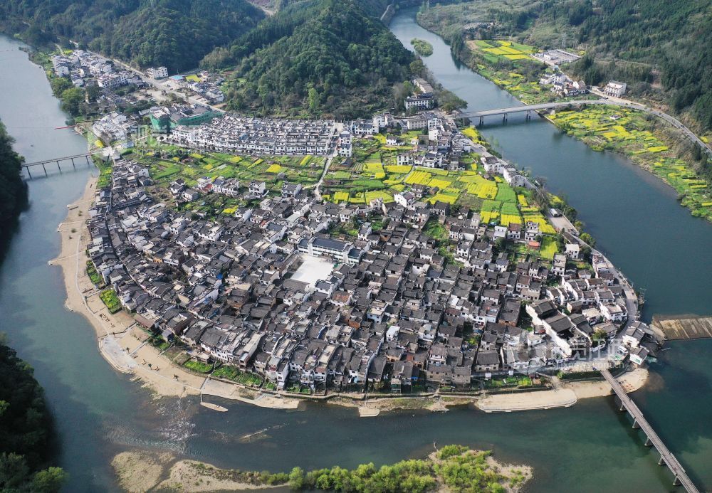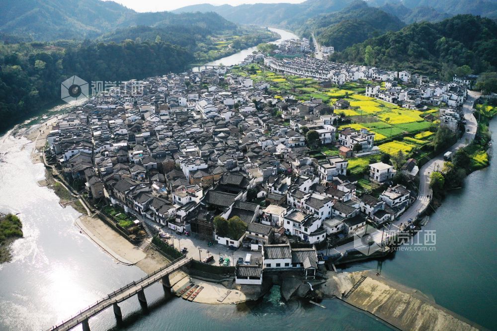 从高空往下看,江湾小河与段莘小河在村南汇合围绕着汪口呈圆形,形成村前一条“腰带水”的三面环水的半岛,与该县大鄣山乡菊径最圆的村庄菊径相媲美。