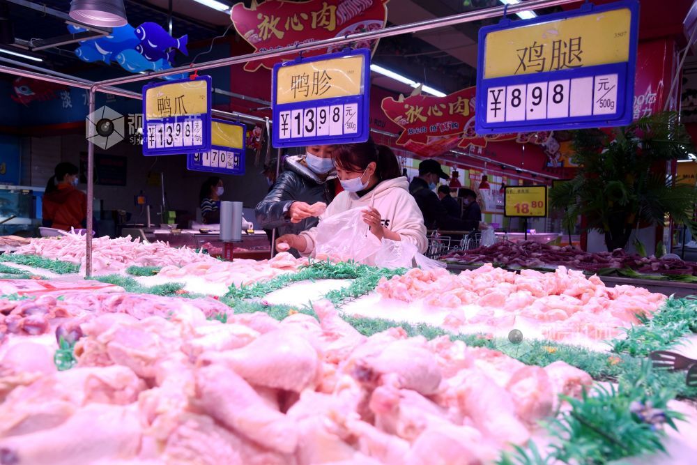 2022年3月23日,在江西省抚州市南丰县一家大型超市内,市民在有序选购肉类、水果、蔬菜等生活必需品。