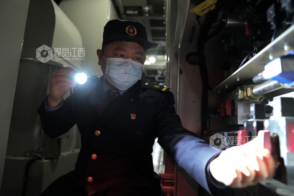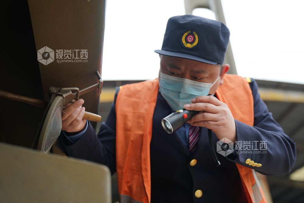 凌晨2时30分,在鹰潭编组三场,江俊手持电筒、检点锤,认真检查着机车走行部各部件,以确保机车健康上线。“疫情当前,许多客运列车停开,保障货物运输安全畅通尤为重要。”江俊说到,许多防疫物资通过铁路运输,自己就是想把运输安全守好。