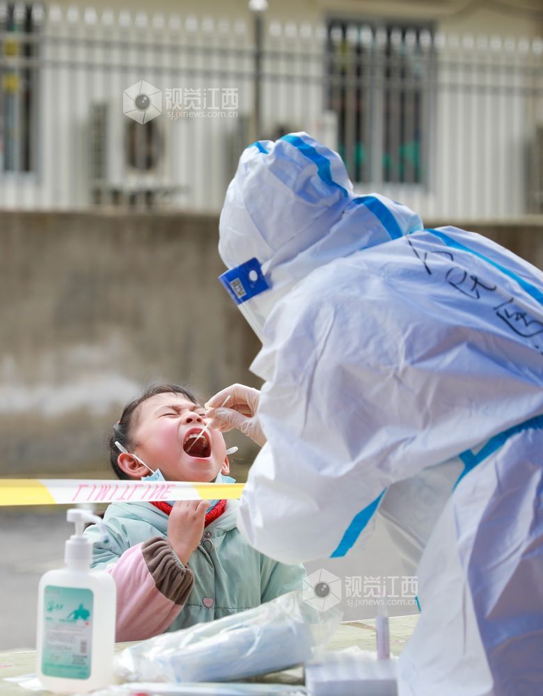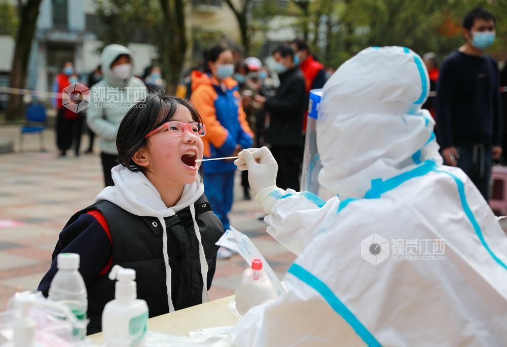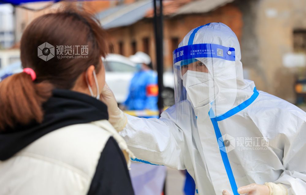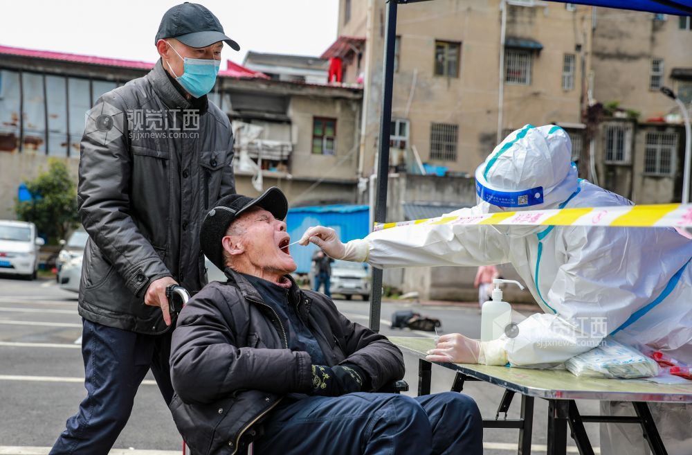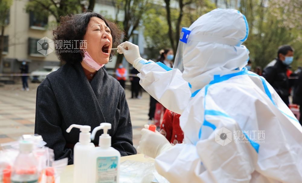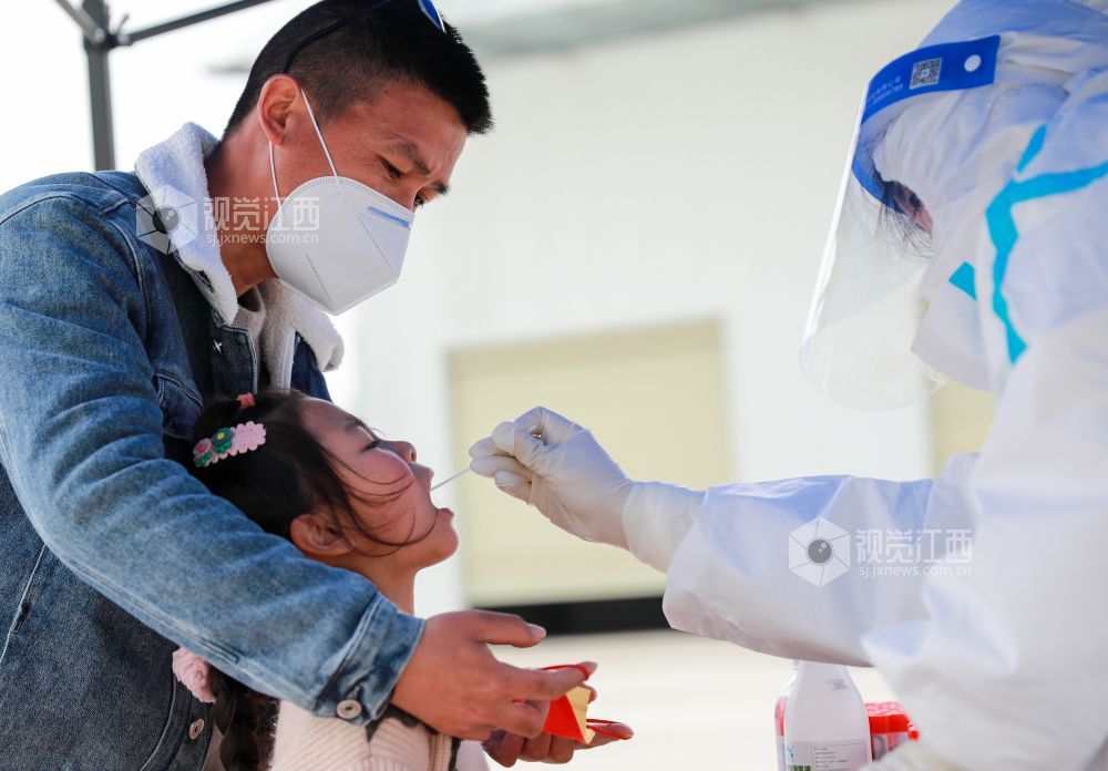 2022年3月24日,江西省瑞昌市城区核酸检测采样点,医务工作者正对市民进行咽拭子采样。