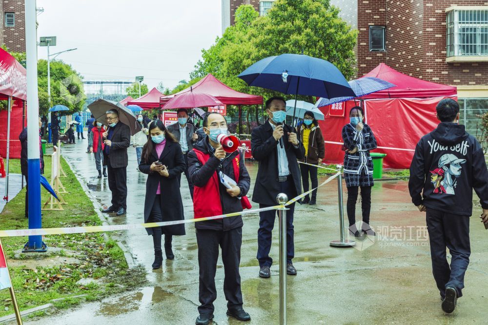 演练期间,小区居民冒着蒙蒙细雨在工作人员的指引下,佩戴口罩有序进场,按照“一米线”间隔排队,依次进行体温测量、信息登记、咽拭子采样等程序开展演练,采样人员及志愿者分工明确,整个演练过程有条不紊,进展顺利。