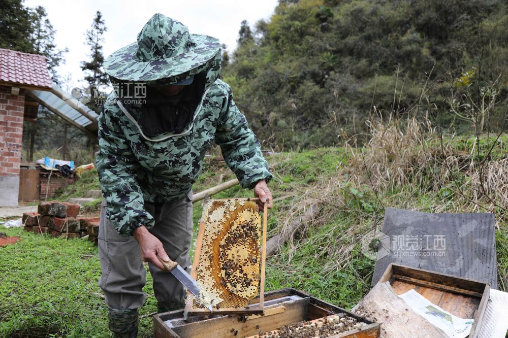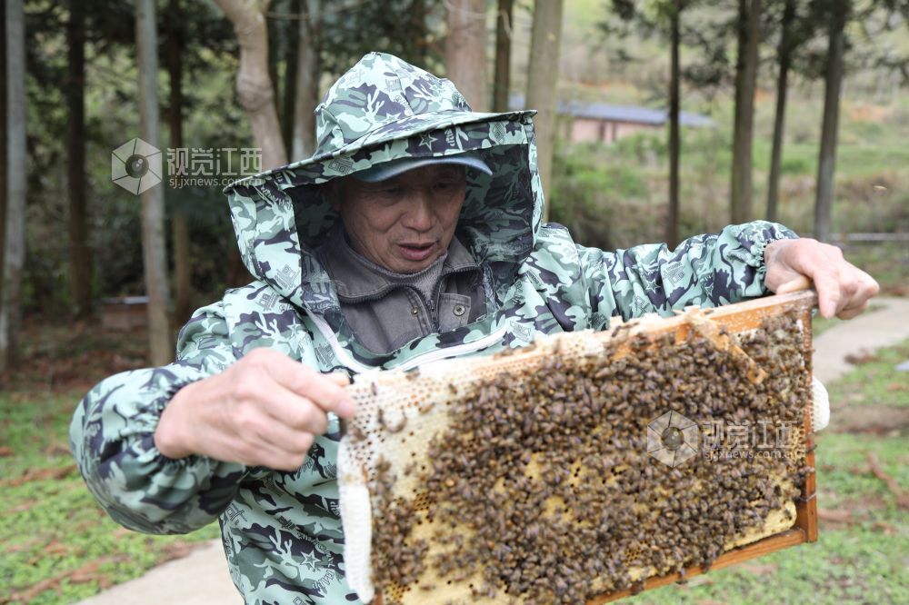 3月28日,江西省莲花县六市乡太沙村养蜂能手马清华正在仔细观察蜜蜂的生长情况。