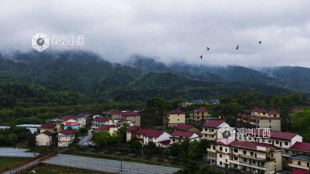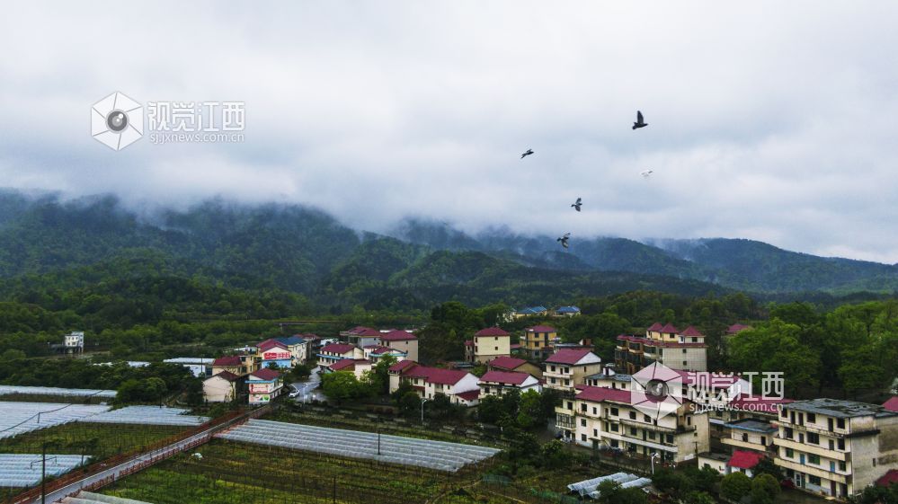 江西新余:湖陂村云雾缭绕鸟儿飞翔
