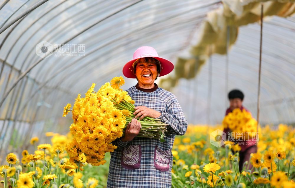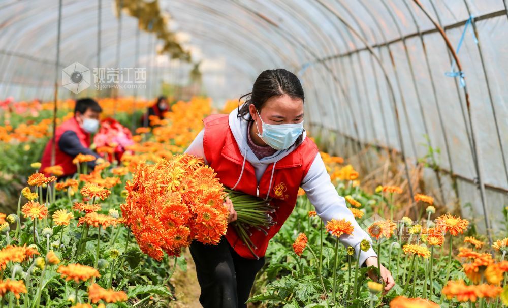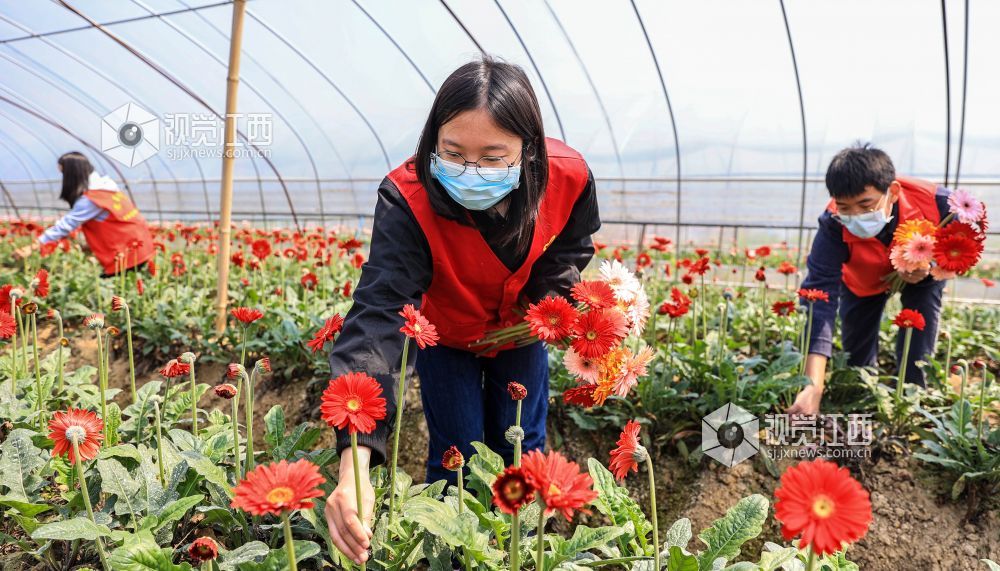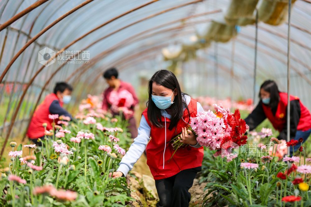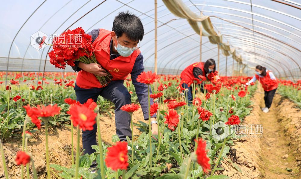 2022年4月3日,江西省瑞昌市高丰镇高丰村花卉基地,花农和该镇党员志愿者正在采摘非洲菊供应清明节市场。