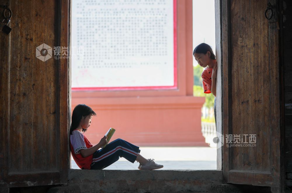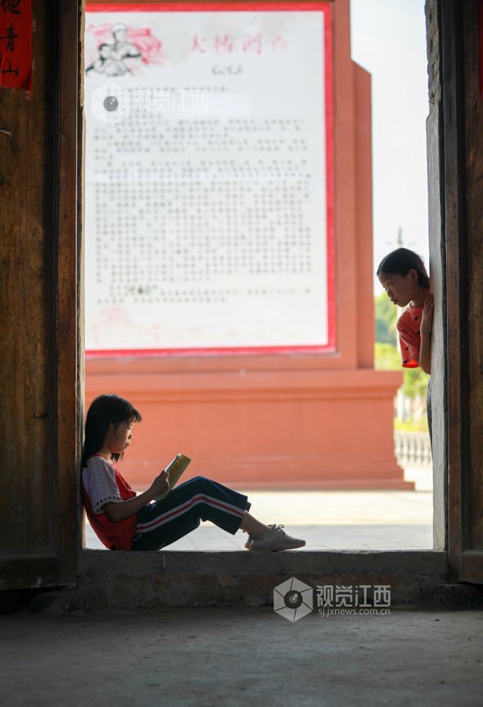 2022年4月3日,清明假期,江西省吉安市吉水县黄桥镇大桥村,一位小朋友正坐在村中祠堂大门口安静的阅读少儿读物。