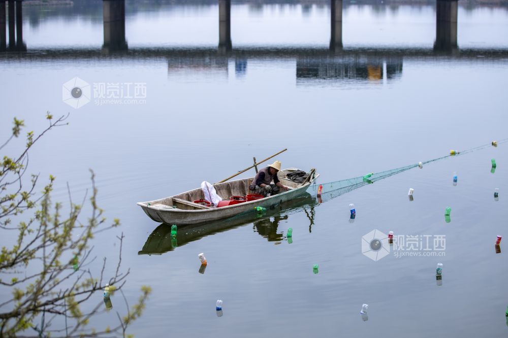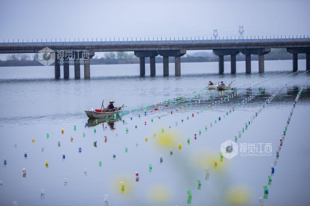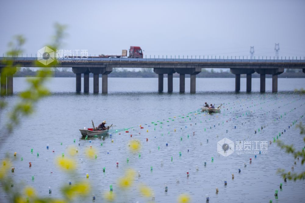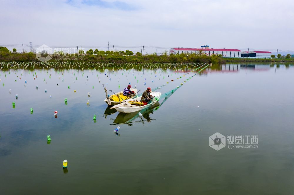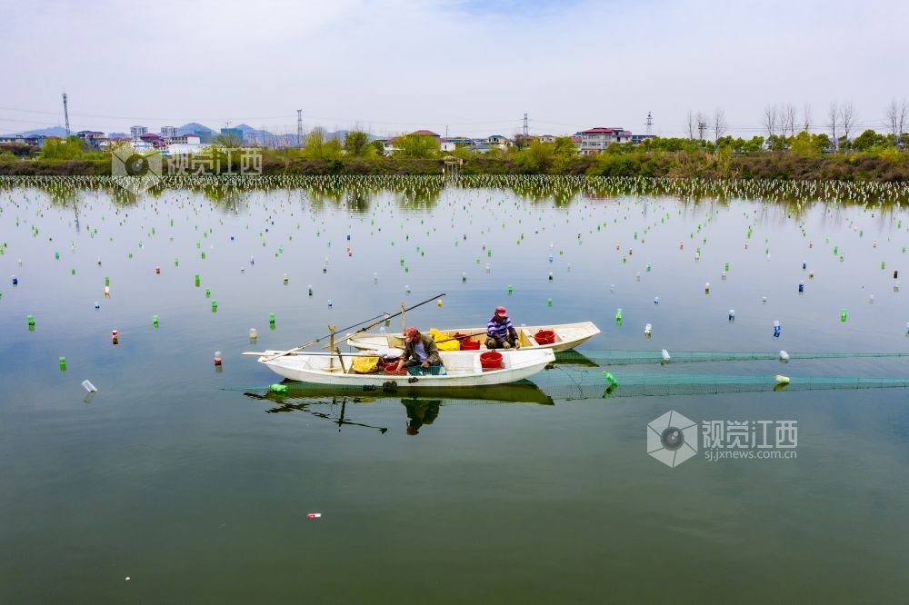 2022年4月4日,江西省九江市湖口县马影镇珍珠生态养殖基地农户正抓住晴好天气,加紧投放珍珠蚌,呈现一派水上“春耕”忙碌的景象。