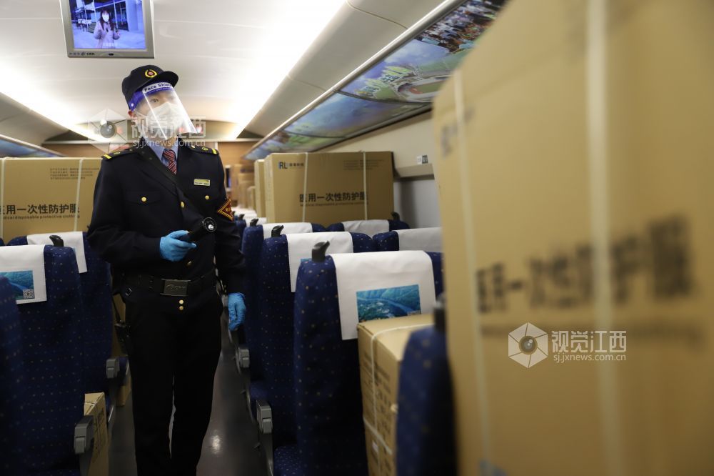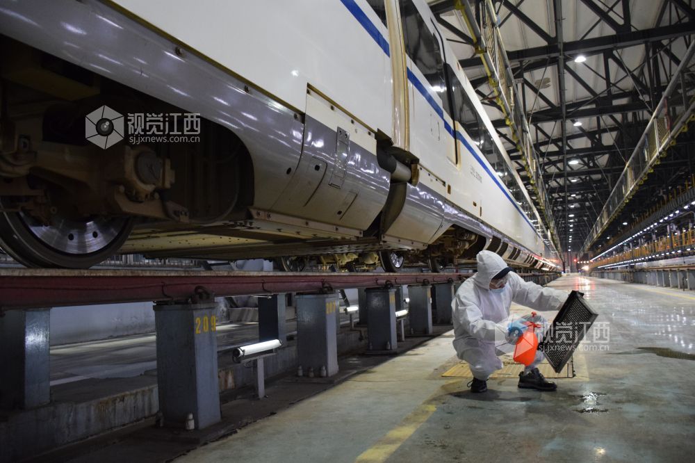 为了提供援沪医疗队安全卫生、舒适优质的出行环境,南昌车辆段由党员骨干牵头组成党员突击队,对担任此次援沪任务的动车组进行全面检修作业。