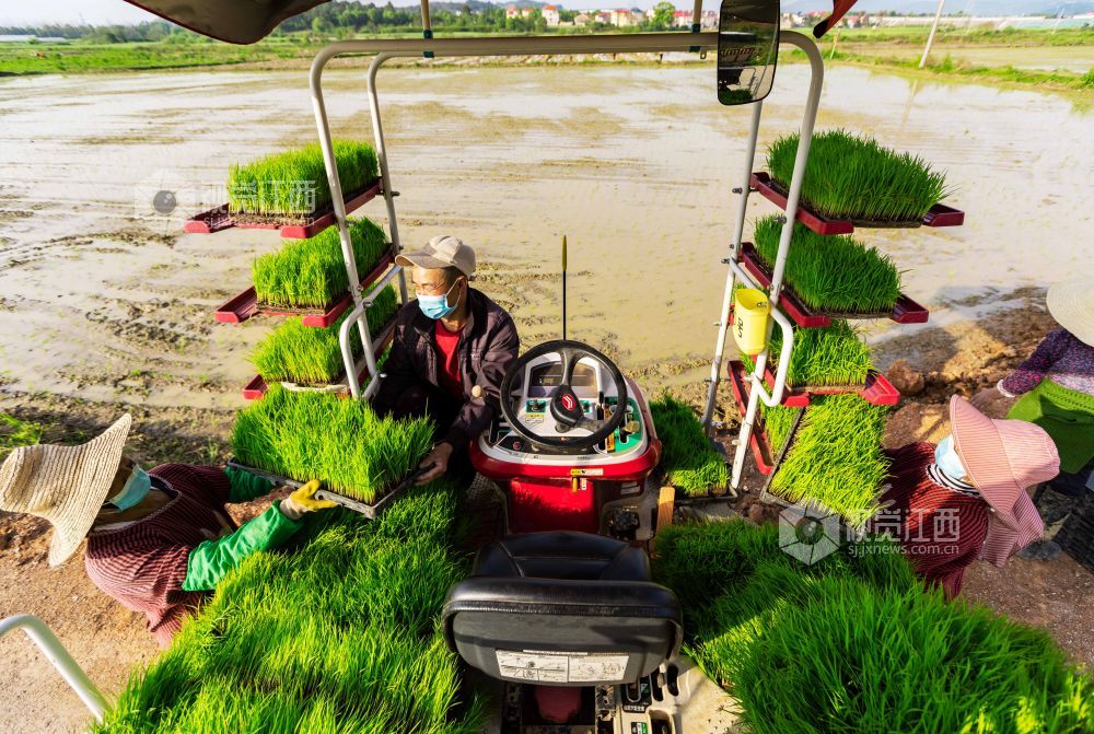 4月6日,在江西省永新县高桥楼镇拿溪村水稻种植基地,当地农民正抢抓农时驾驶农机在田间插秧,田间地头一派繁忙景象。