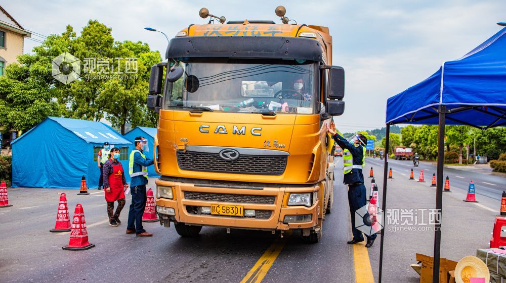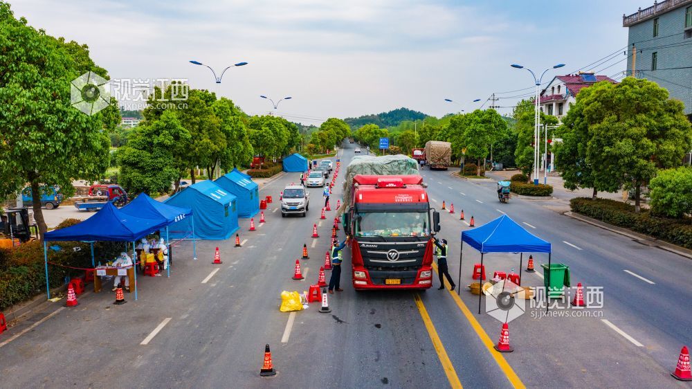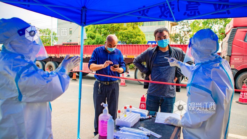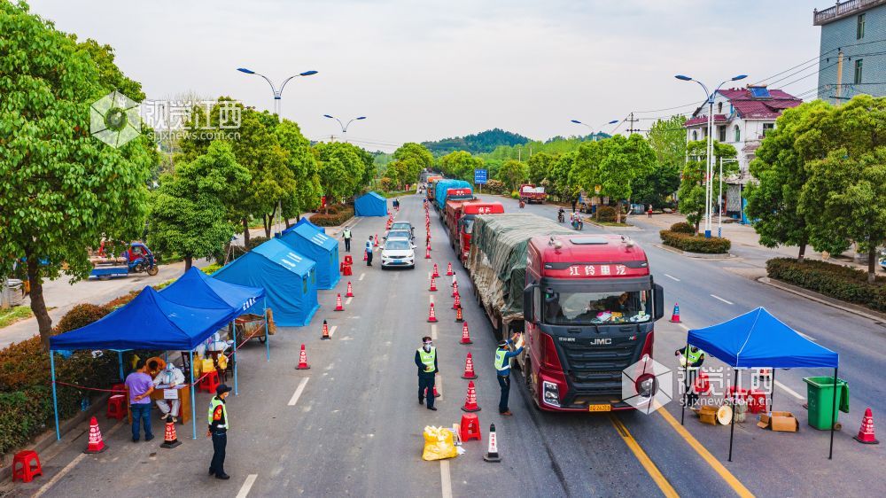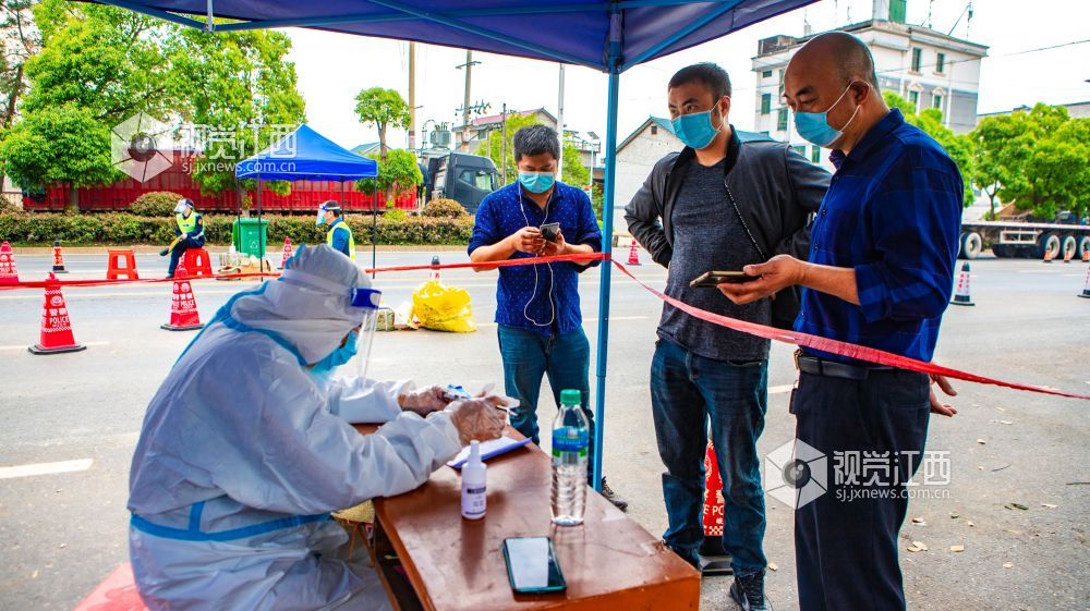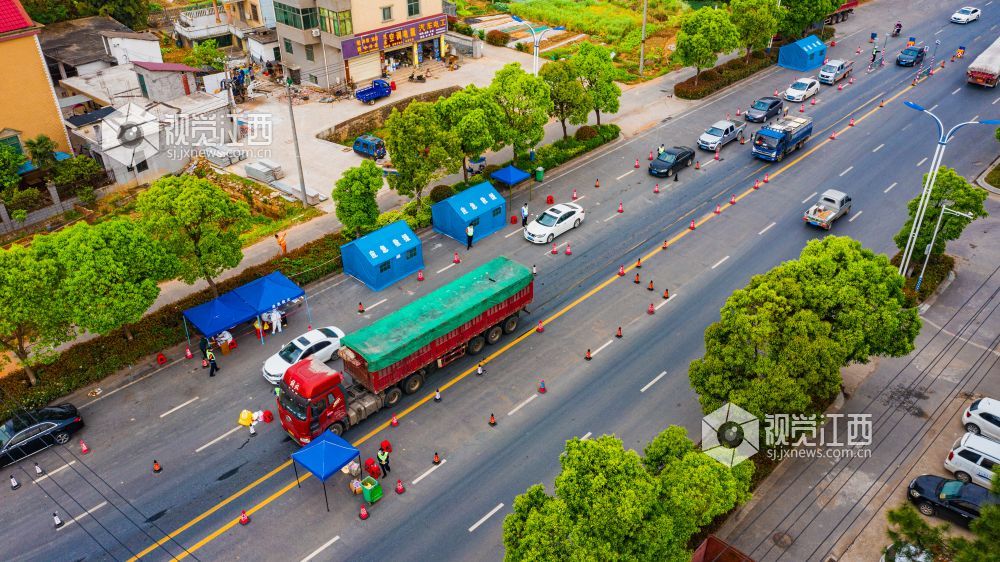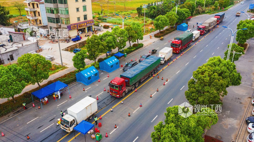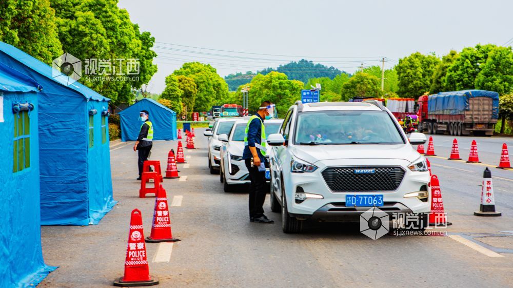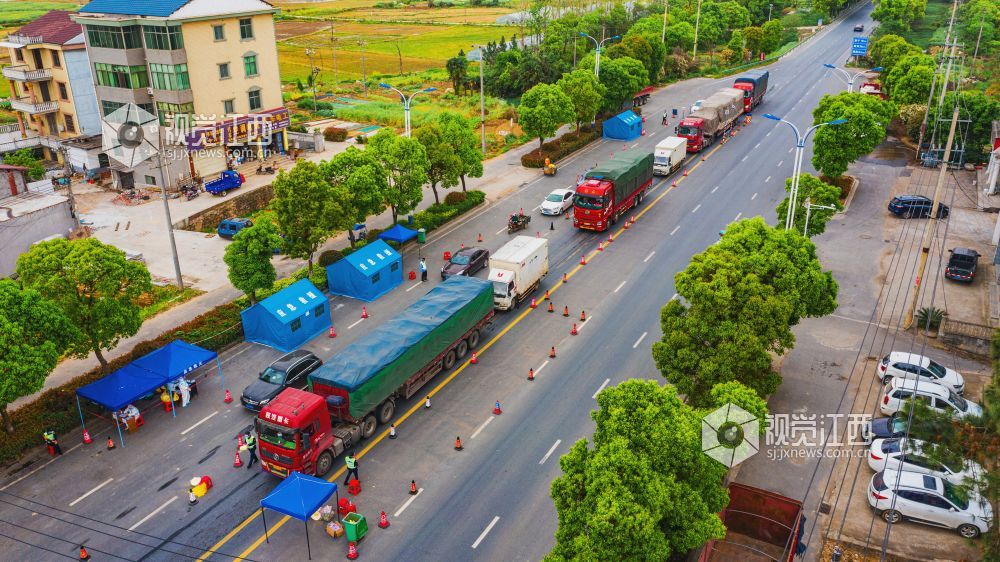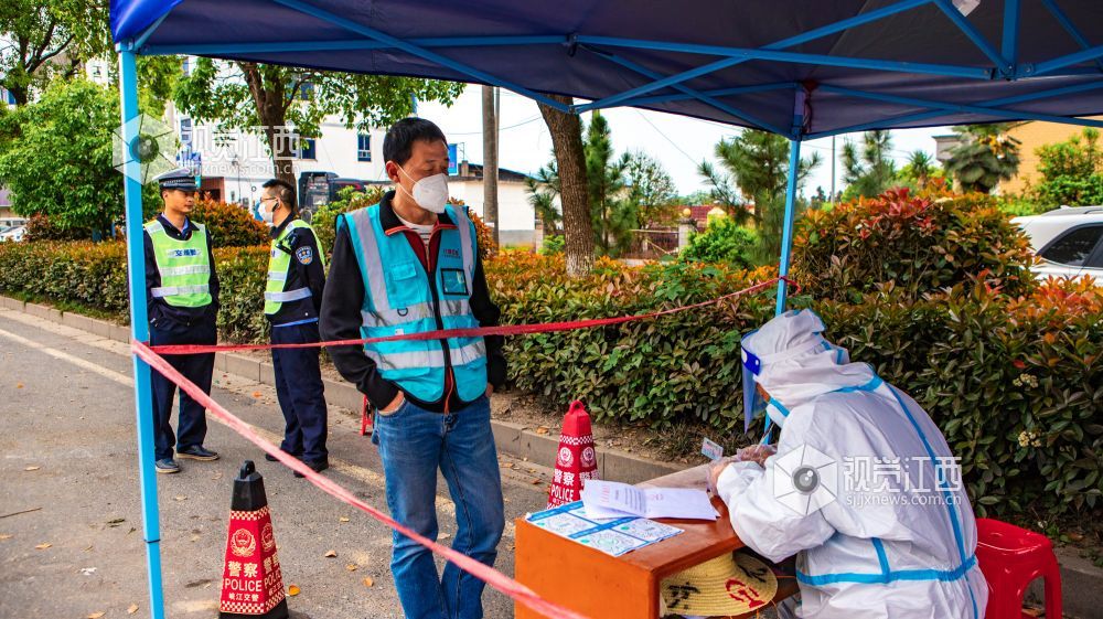 在江西省吉安市峡江县水边镇郭家村出口处县疫情防控检查点,由公安民警、交警、交通、市场监督管理、城市建房管理、乡镇干部和医疗人员等部门组成的疫情防控联队坚守岗位,对进入峡江的车辆和人员实施登记、核查“两码一报告”及进行核酸检测工作,筑牢交通卡口疫情防线。