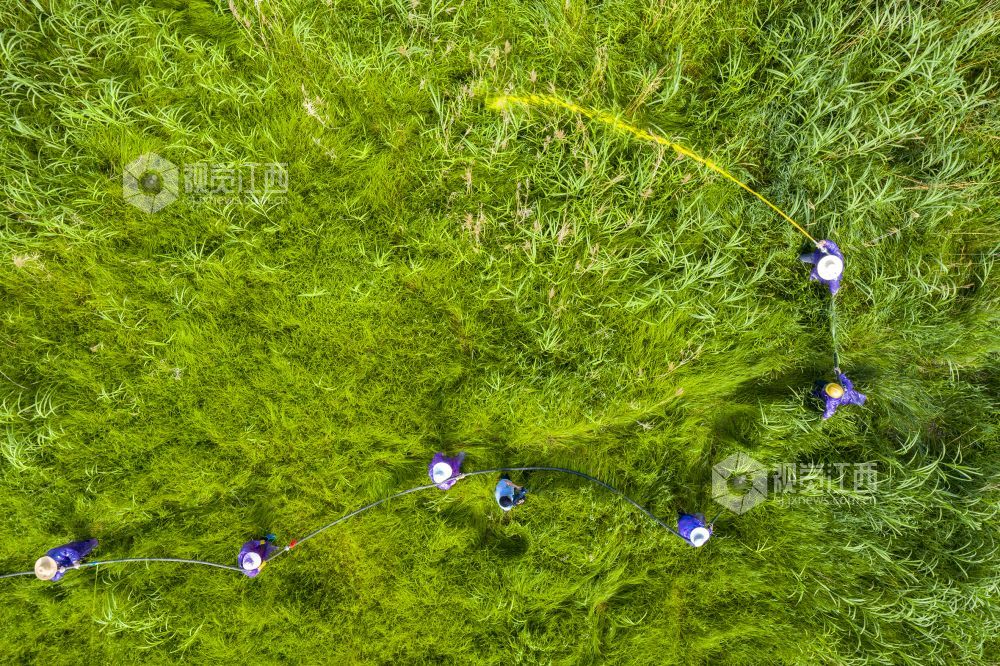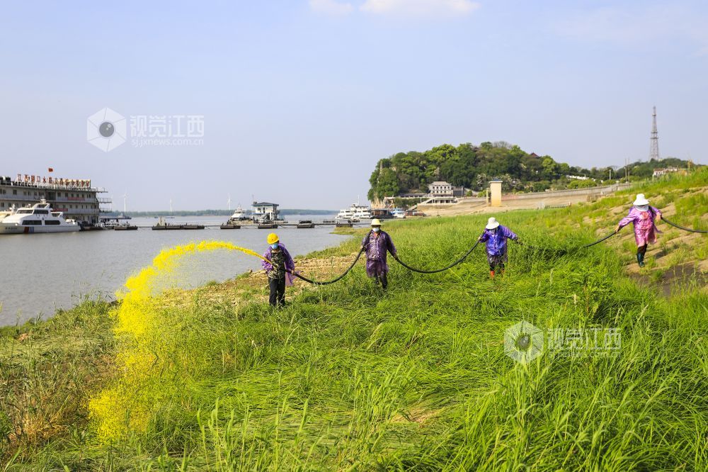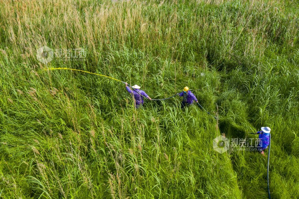 2022年4月12日,江西省九江市湖口县血防站组织专业队伍正在鄱阳湖畔螺草洲进行药物灭螺。