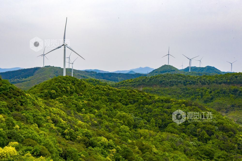 2022年4月14日,江西省九江市湖口县舜德乡屏峰山脉风机林立,叶片转动,正在不断输送绿色清洁电力能源。
