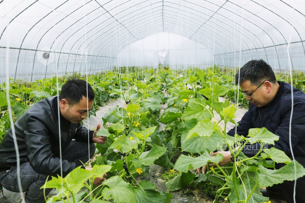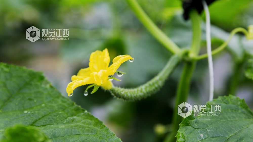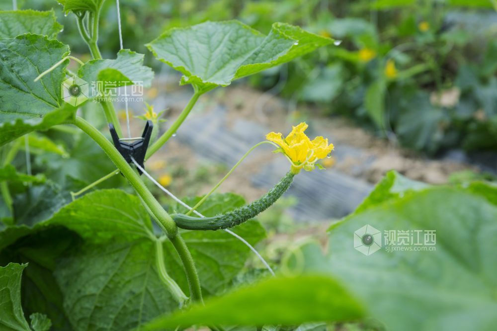 4月16日,江西省新余市渝水区姚圩镇河埠村种植的黄瓜开始开花结果了,蔬菜大棚里花果飘香。