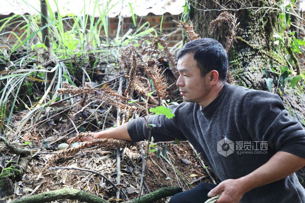 2022年4月19日,江西省莲花县神泉乡大湾村脱贫户颜忠华正在喂鸡。