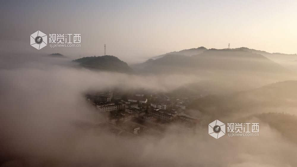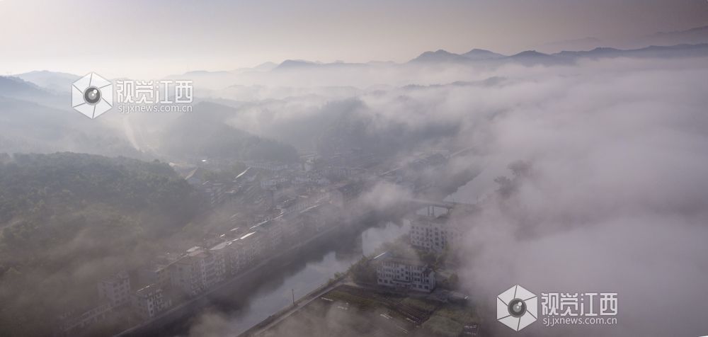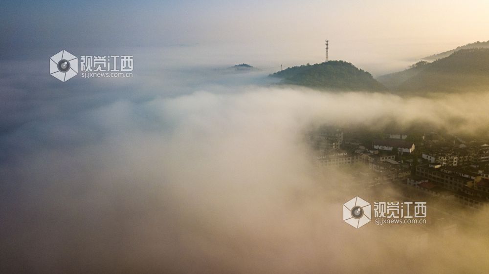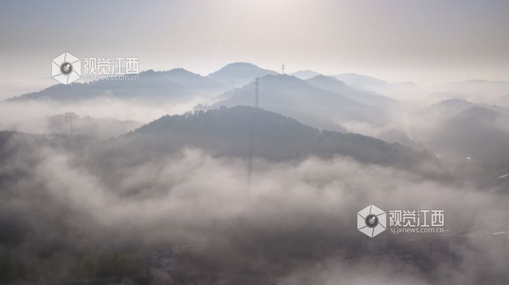 2022年4月21日清晨,江西省分宜县洋江镇内上空云雾迷蒙,宛如仙境。从高空俯瞰,整个乡村被晨雾笼罩,像是一层薄纱,又像是炊烟般,缥缥缈缈,若隐若现,美不胜收。